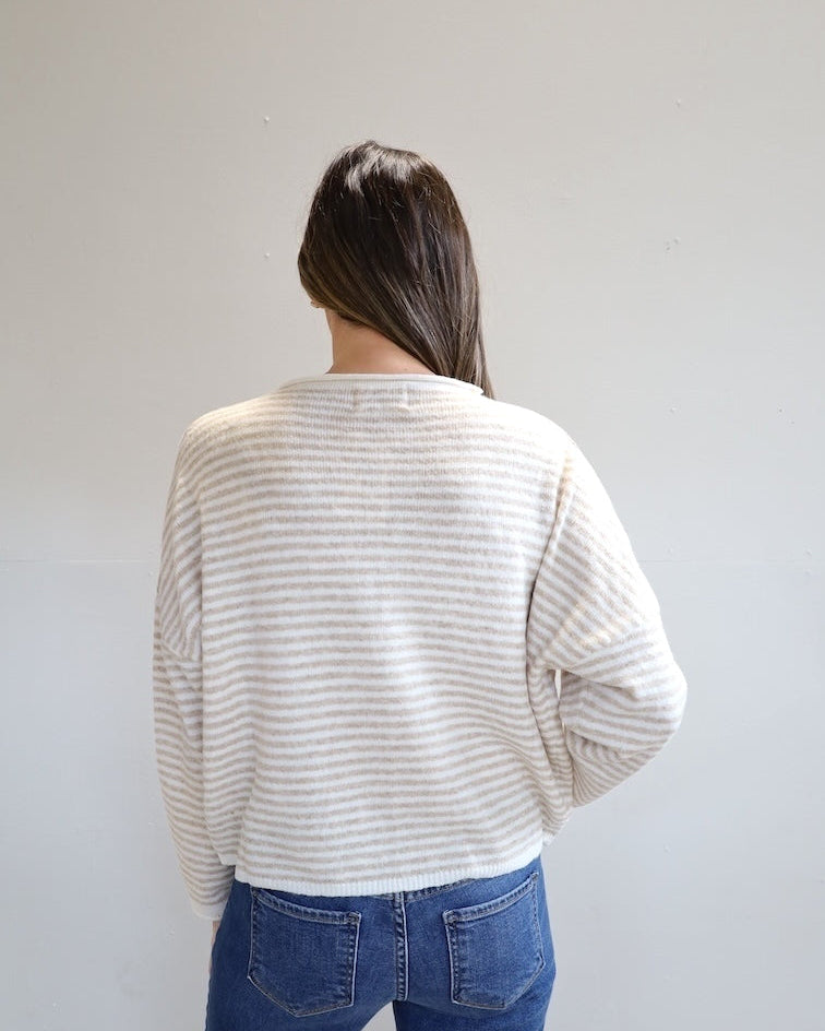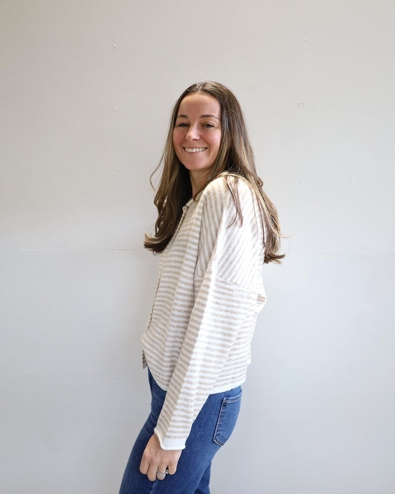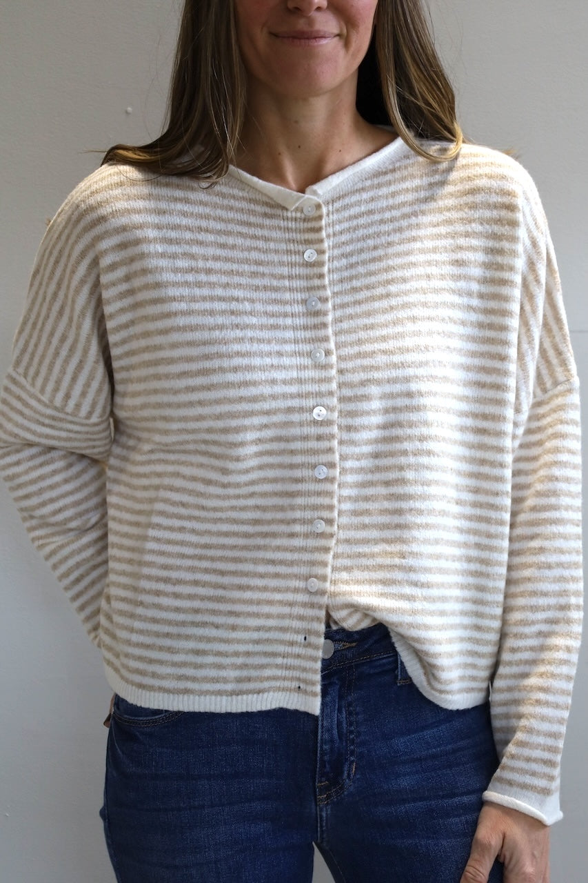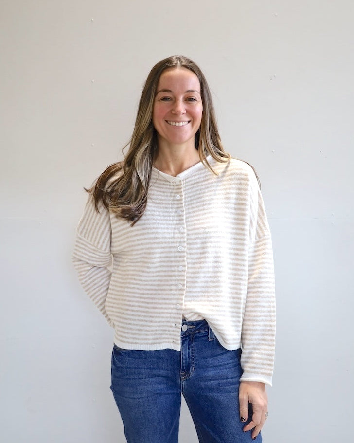 Effortlessly chic and cozy, this beige and white striped cardigan features a relaxed fit and classic button front. Perfect for layering, it adds a touch of casual elegance to any outfit.