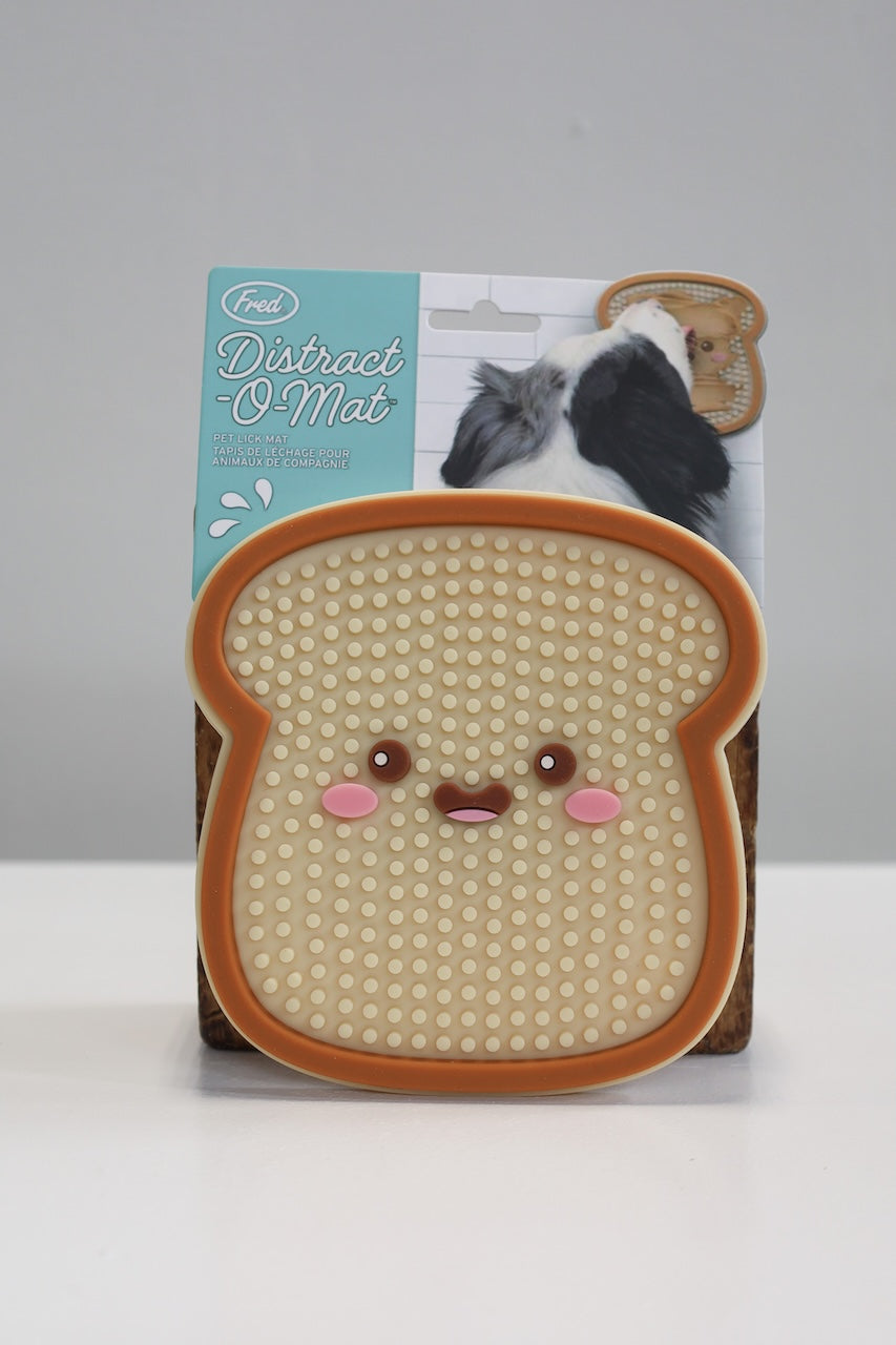 Fred's dog lick mat is designed to provide a soothing distraction for your dog while bathing or grooming. Simply spread peanut butter (or similar spreadable snack) on the “bread” and adhere to any smooth surface with its five strong suction cups. It is dishwasher-safe and made of BPA-free, food-safe silicone.