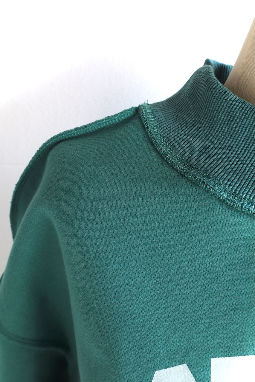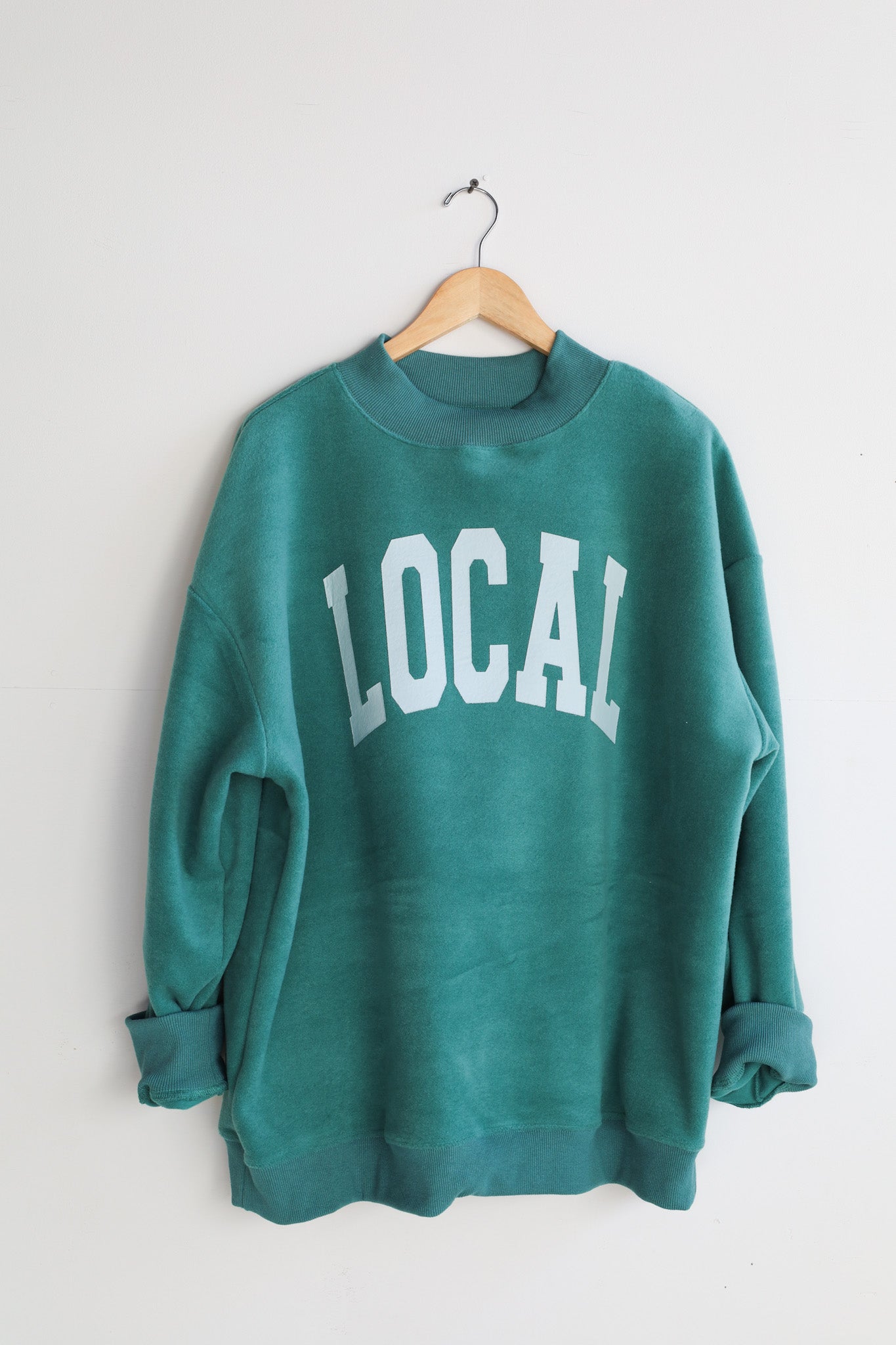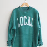 This sweatshirt is reversible and says "LOCAL" on the reverse side.