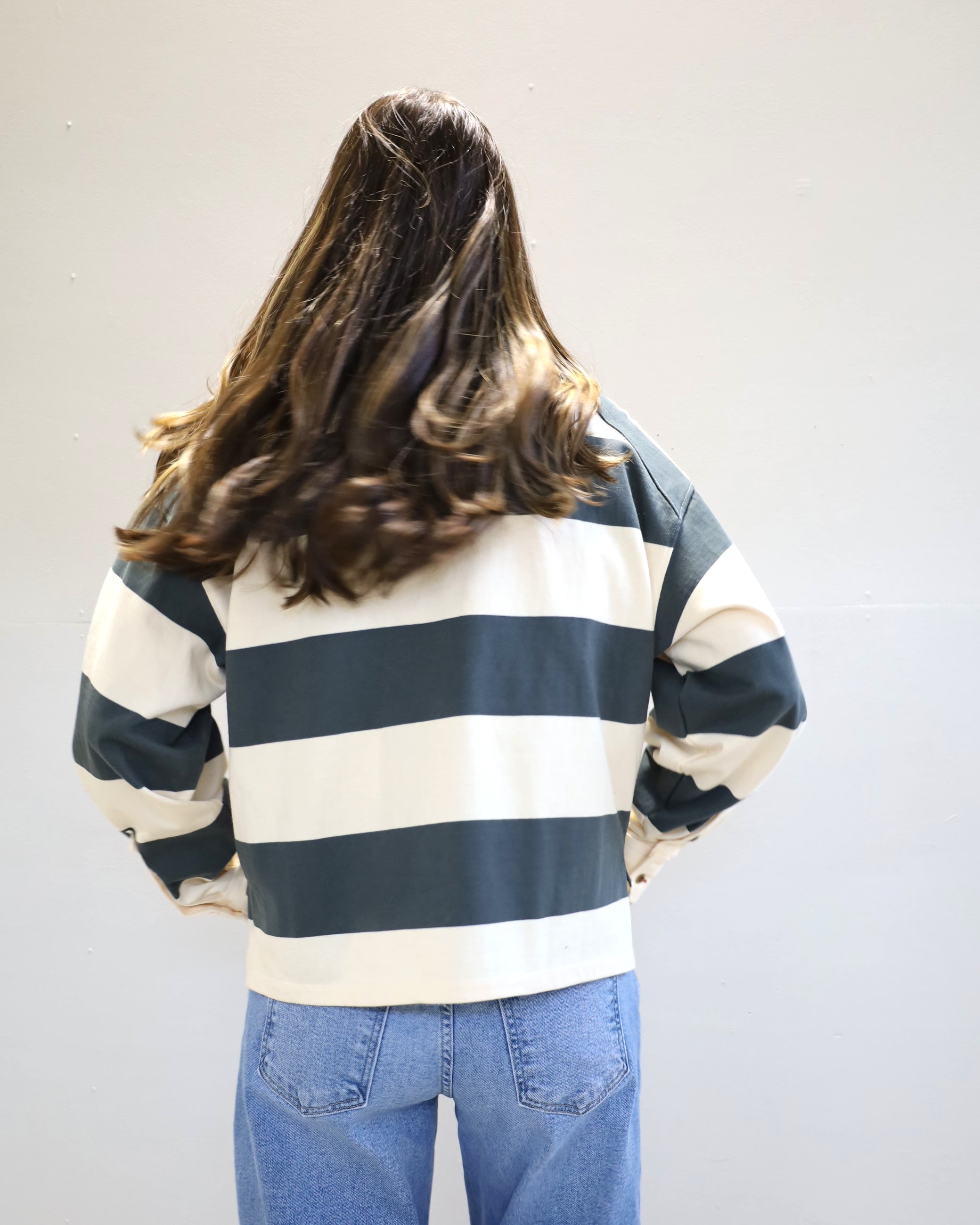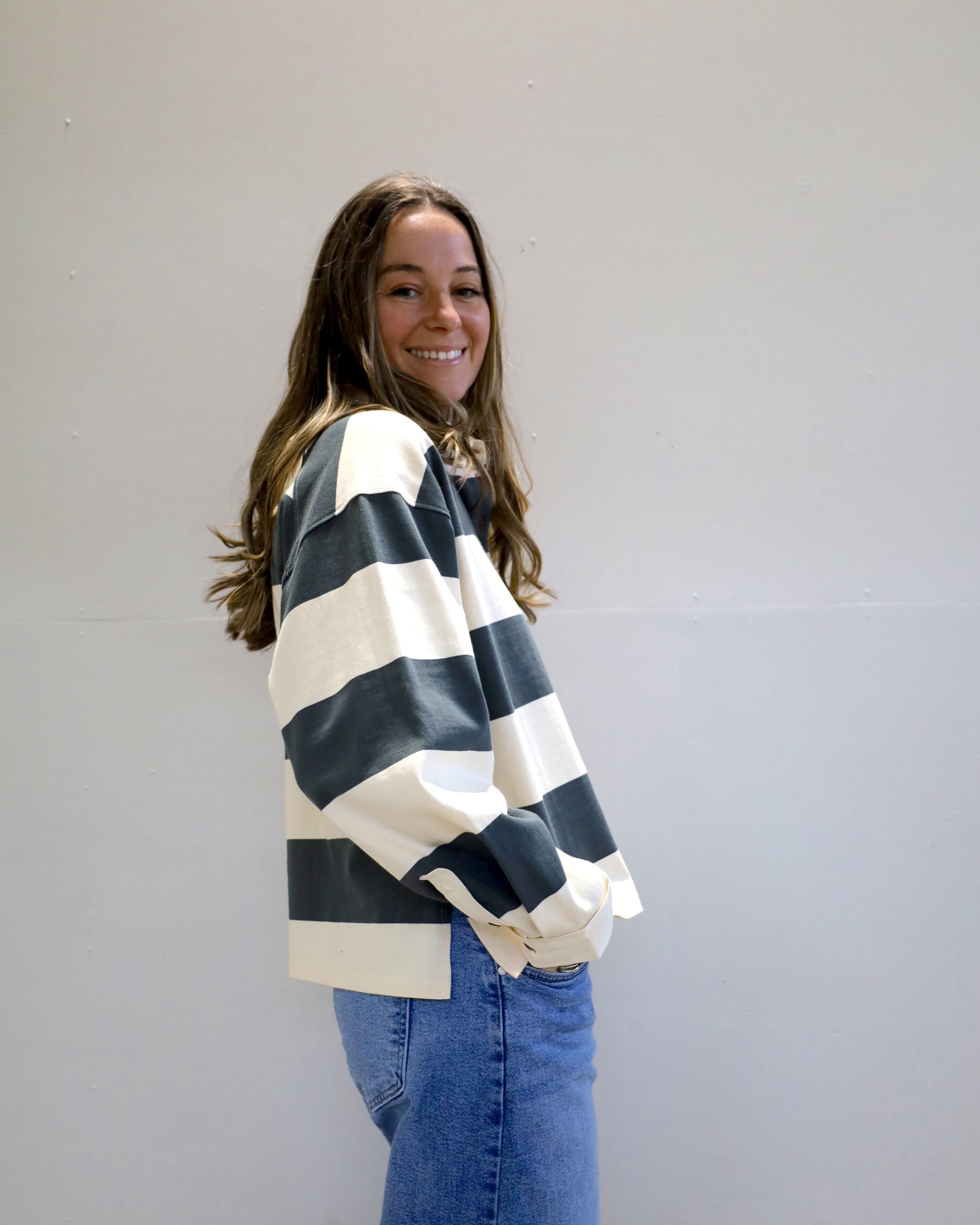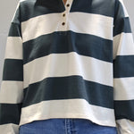 Score serious style points with our classic Evelyn Shirt! This classic rugby style top features bold, wide stripes and a crisp contrasting collar.