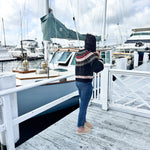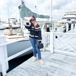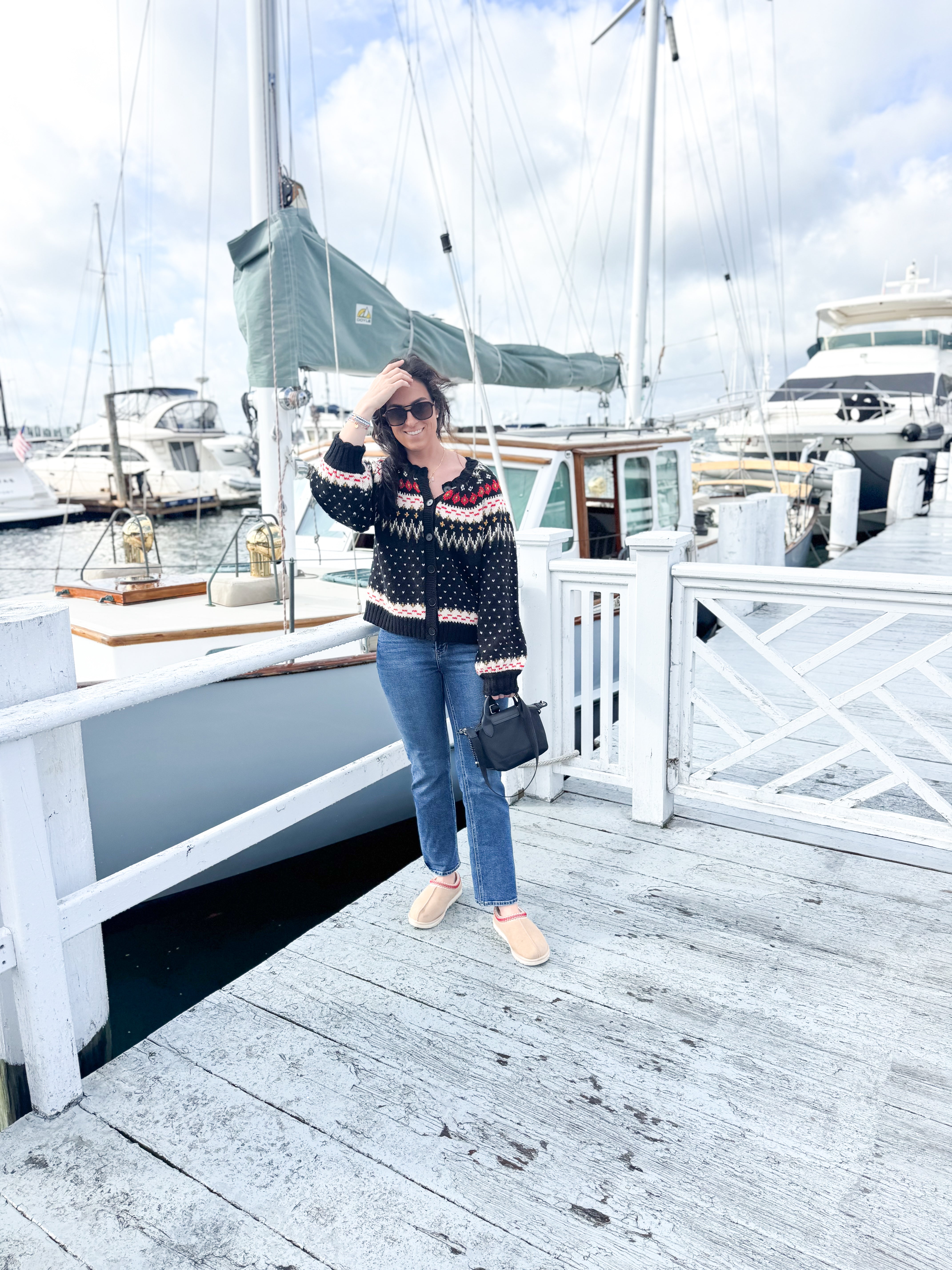 A coastal classic with a touch of après-sail charm. This thick knit cardigan features a traditional Fair Isle pattern in black, ivory, and pops of red—giving it that perfectly nostalgic, New England feel. The slightly cropped silhouette and relaxed fit make it easy to layer over a tee or pair with your favorite denim for a harbor stroll or fireside evening.
