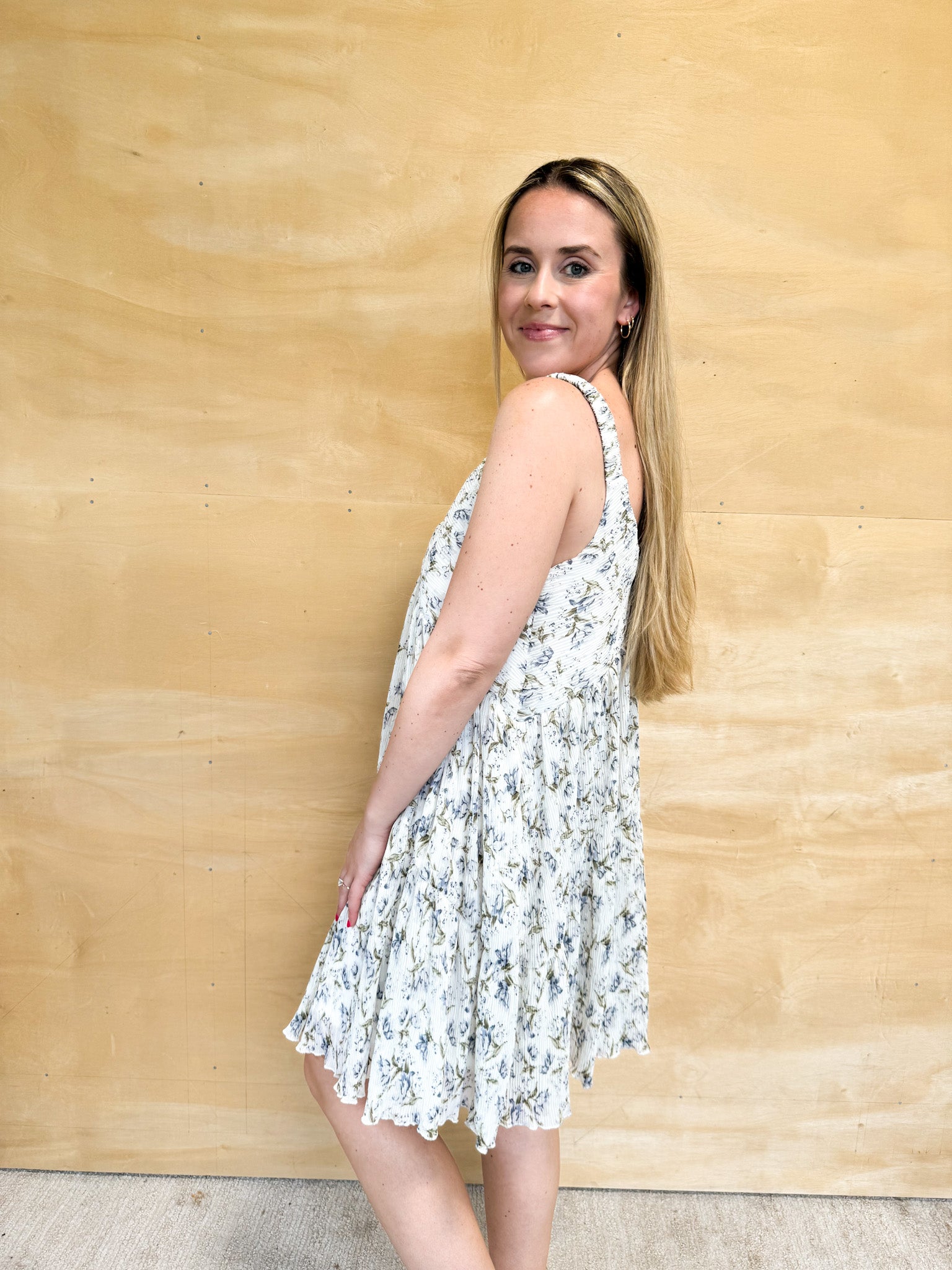 The Floral Frenzy Dress is soft, flirty, and made to twirl—featuring a flowy silhouette with a delicate floral print and pleated texture throughout. Lightweight and fully lined for an easy, throw-on-and-go fit.