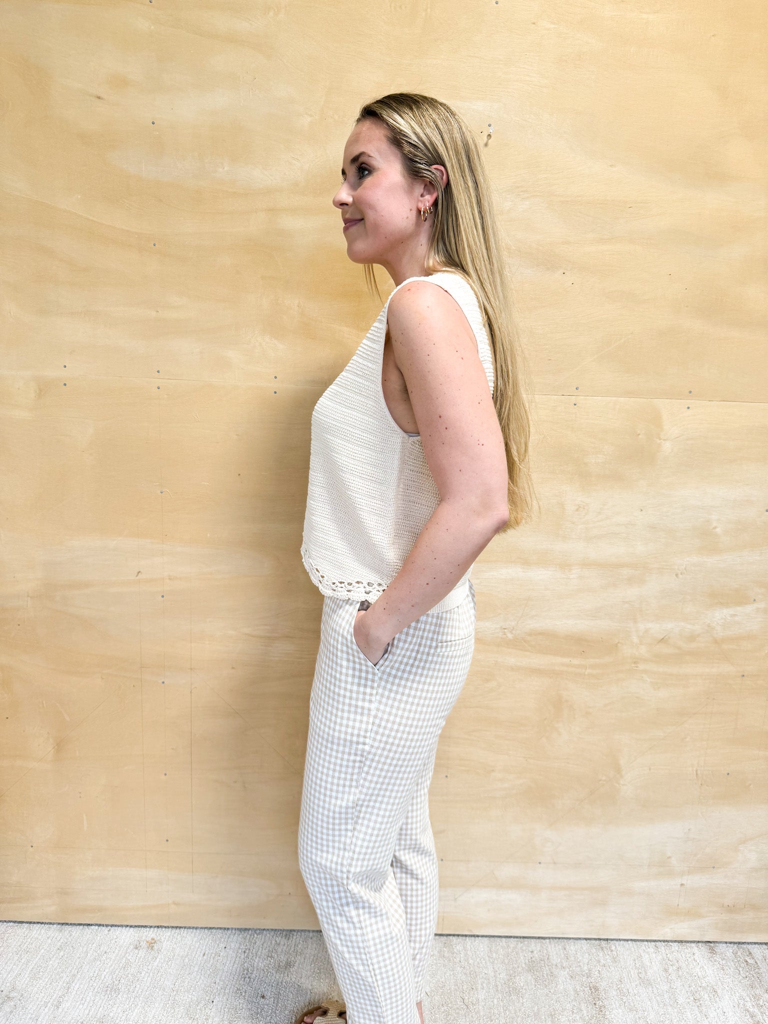 The Gingham Pants are a playful take on a classic gingham print, featuring a breezy wide-leg fit and soft, lightweight fabric that moves with you. Perfect for summer days or a classy chic moment.