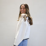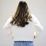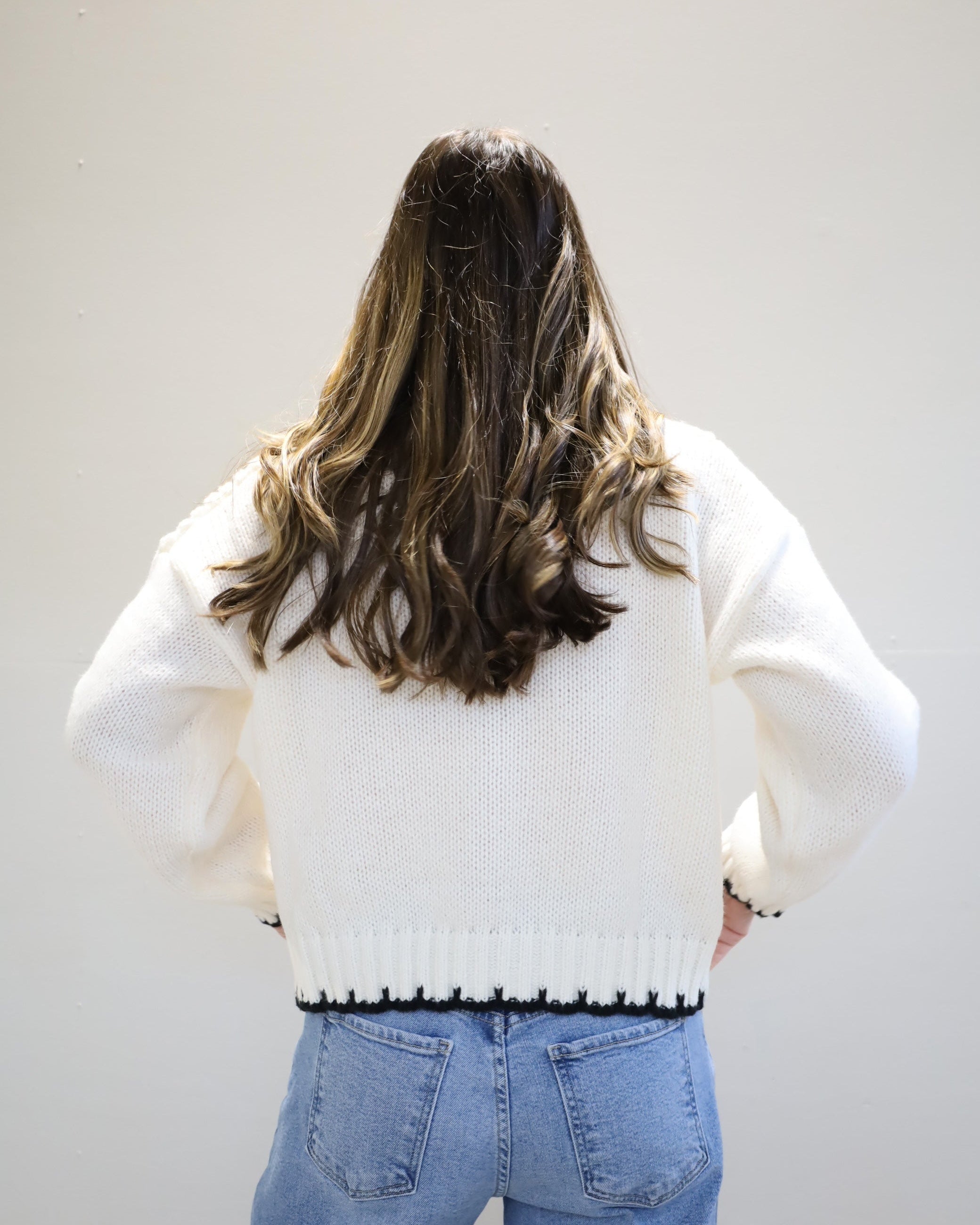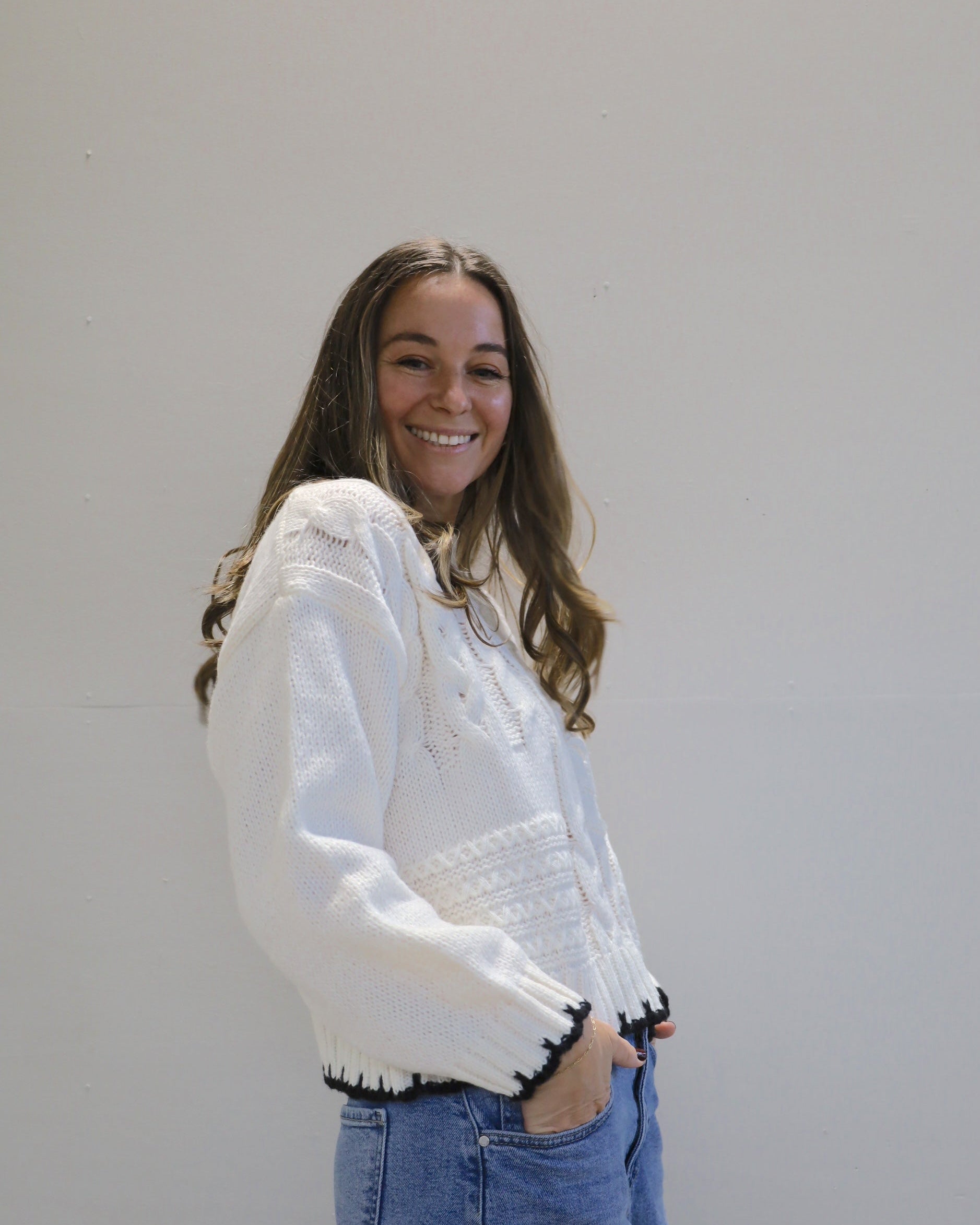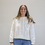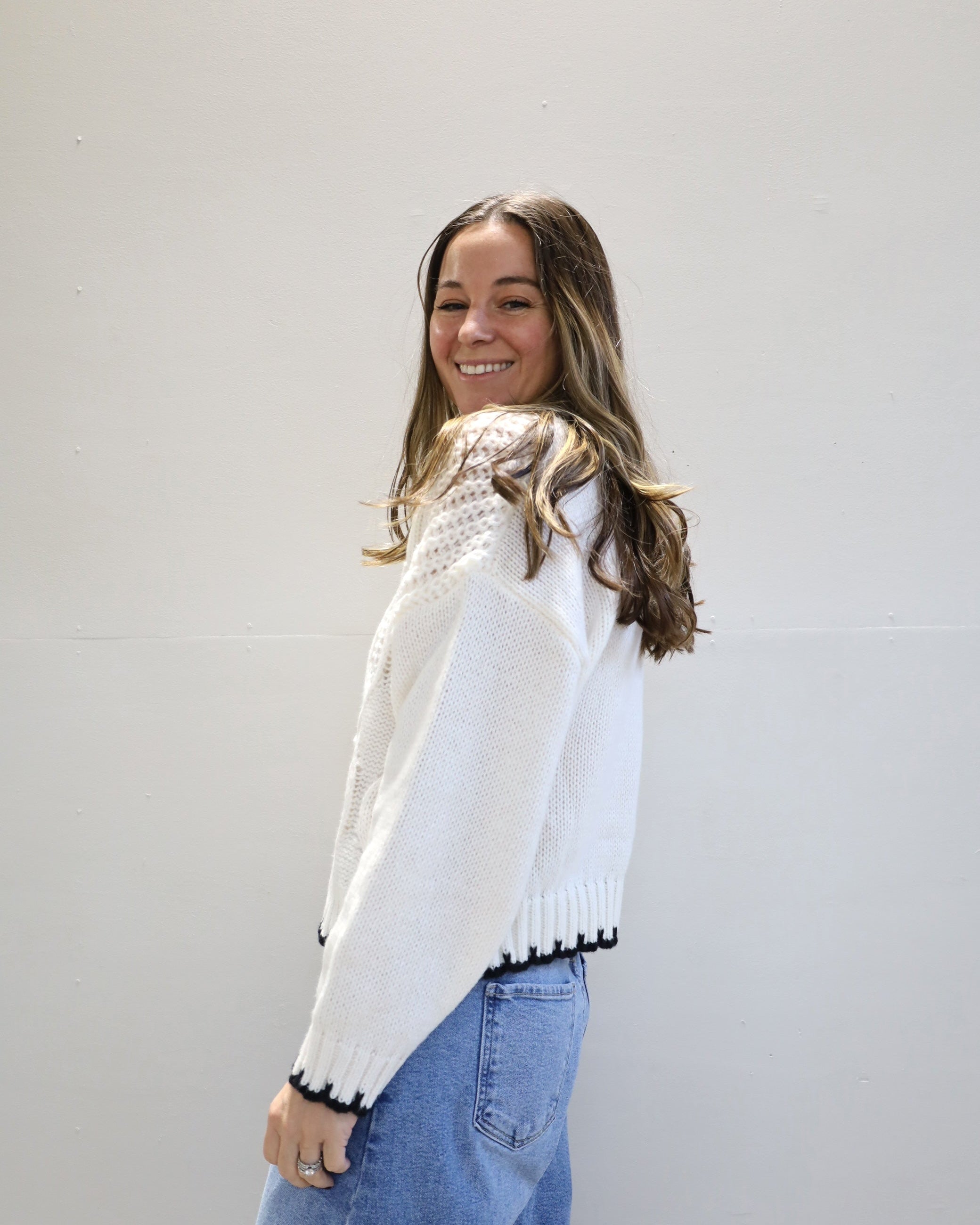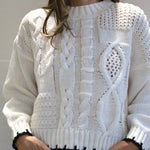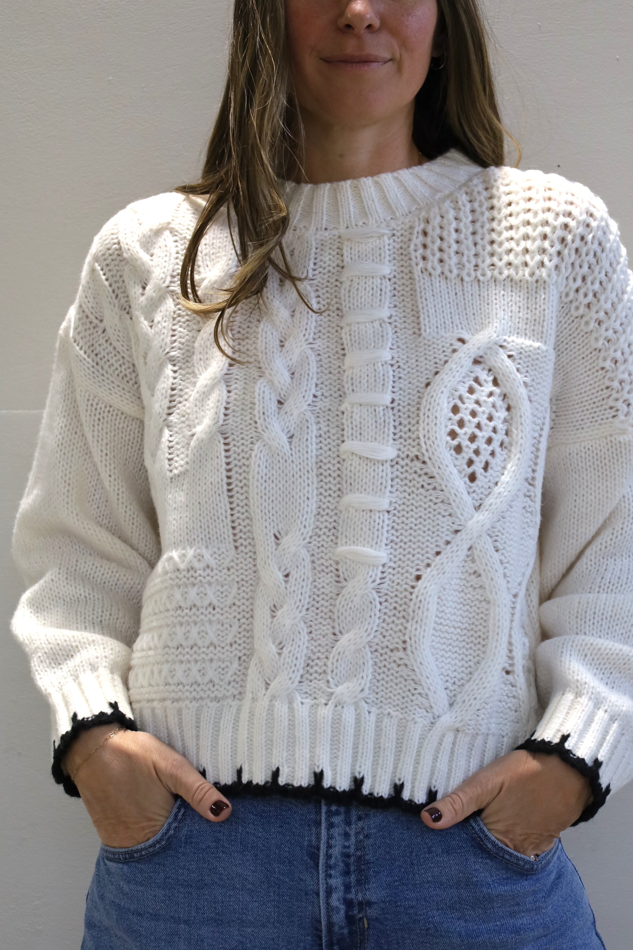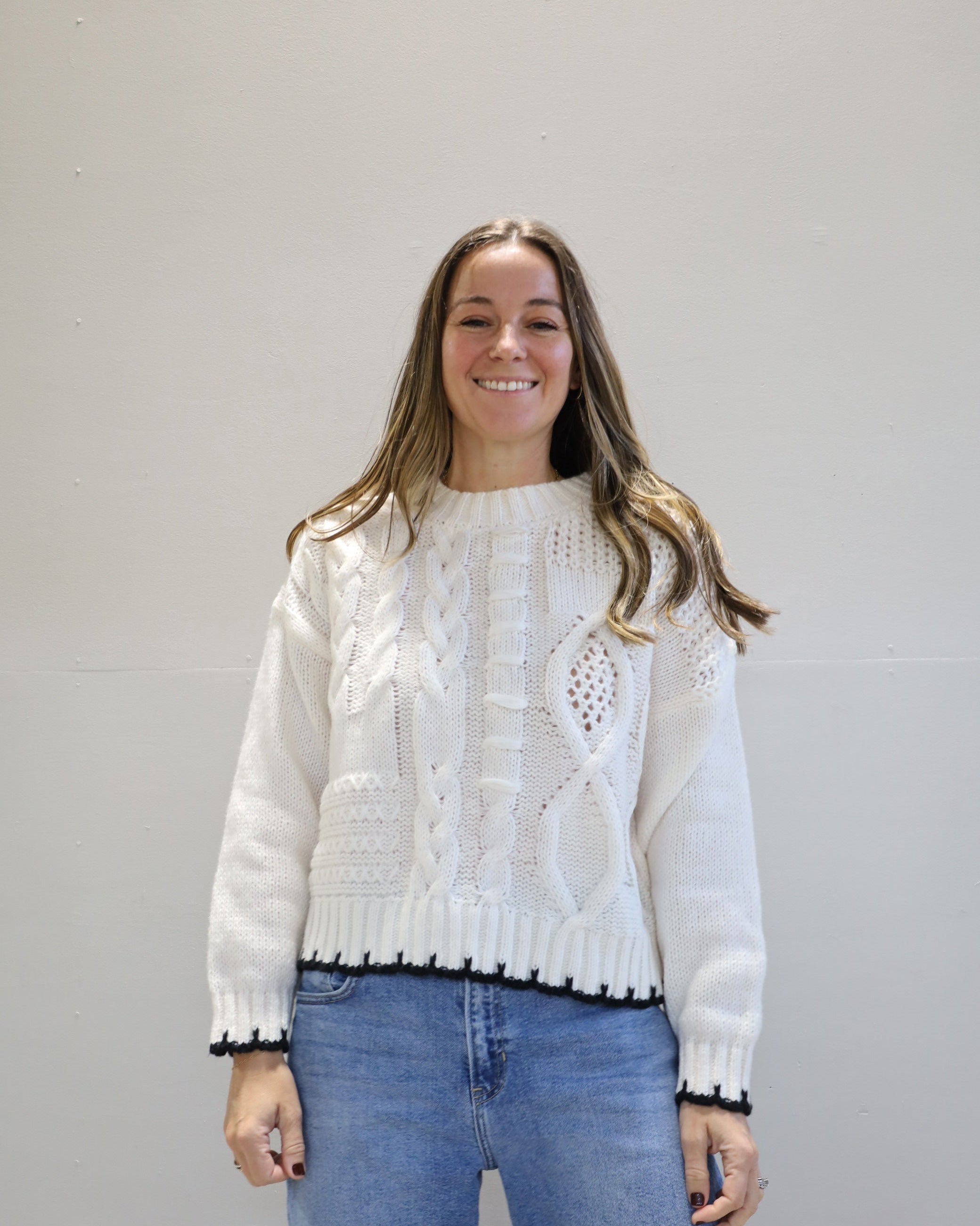 This mixed-stitch cable knit is anything but basic, featuring different textures and finished with a sharp contrast trim.