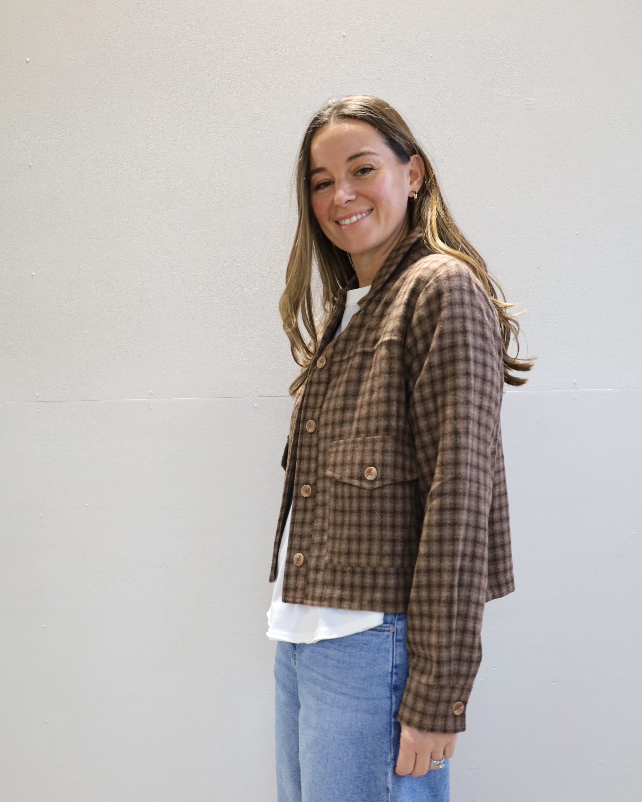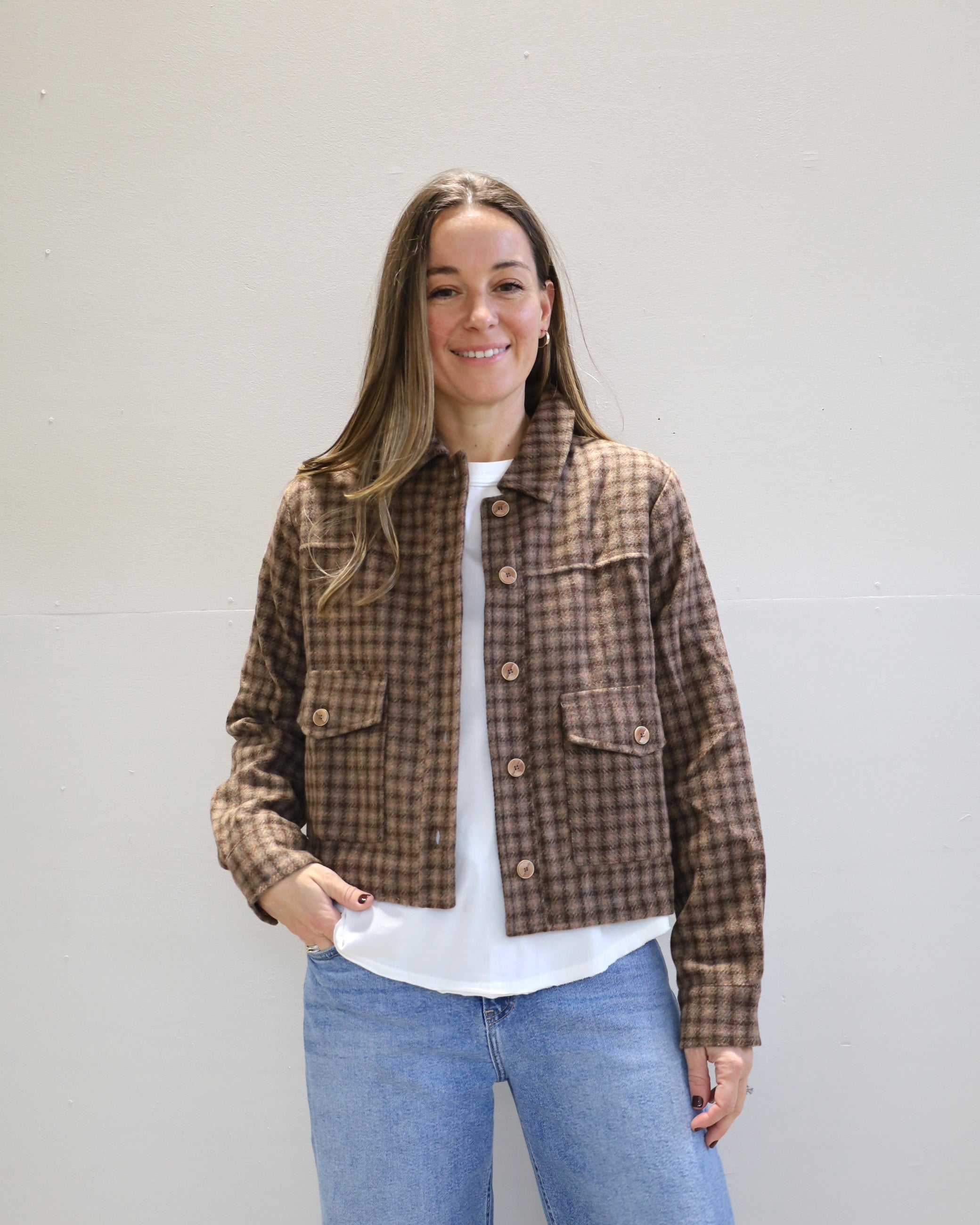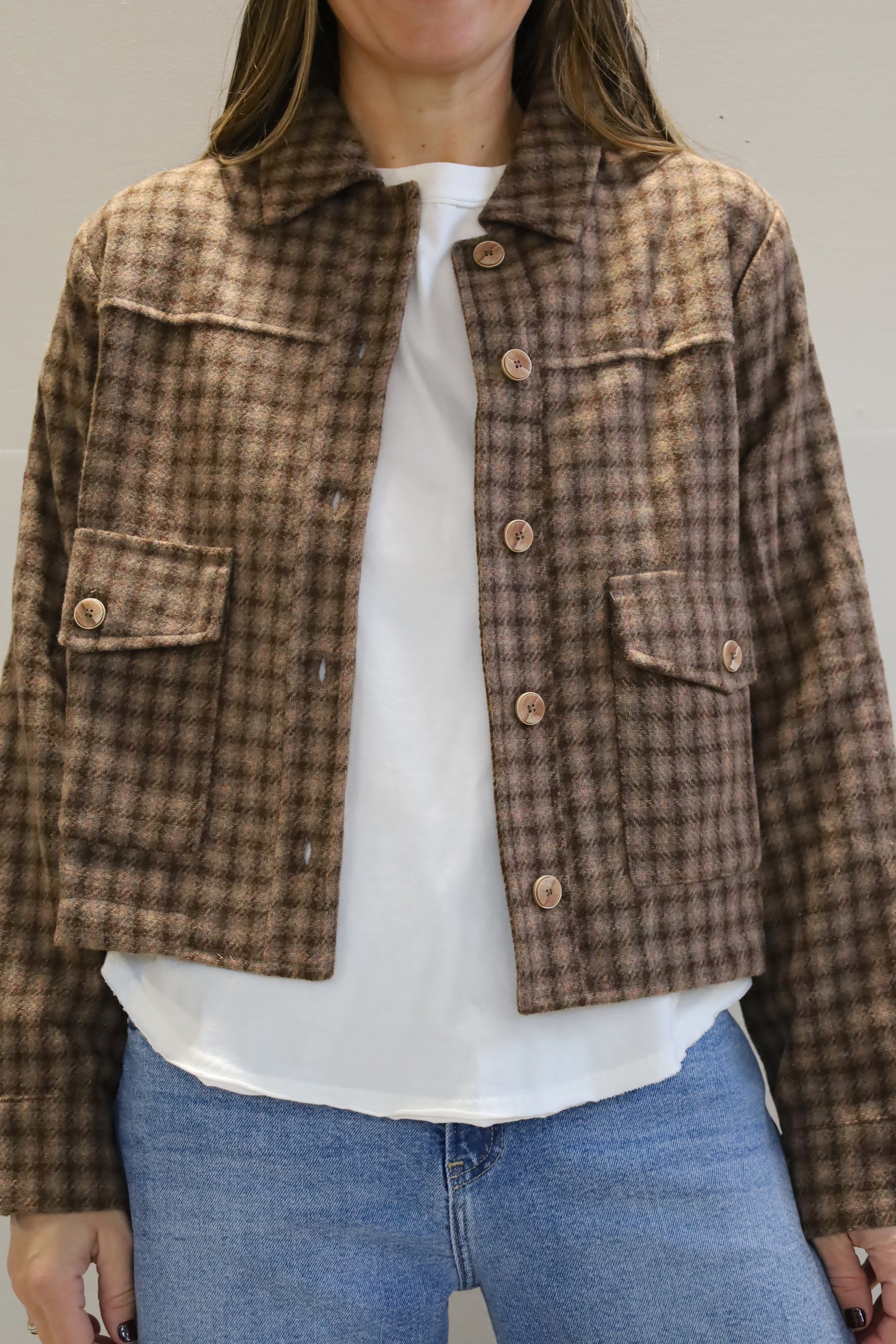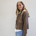 Meet your new favorite layering piece! With a modern plaid design and cropped fit, this jacket can be worn on it's own, with your favorite patterned top, with high waisted denim or your favorite skirt for any occasion!