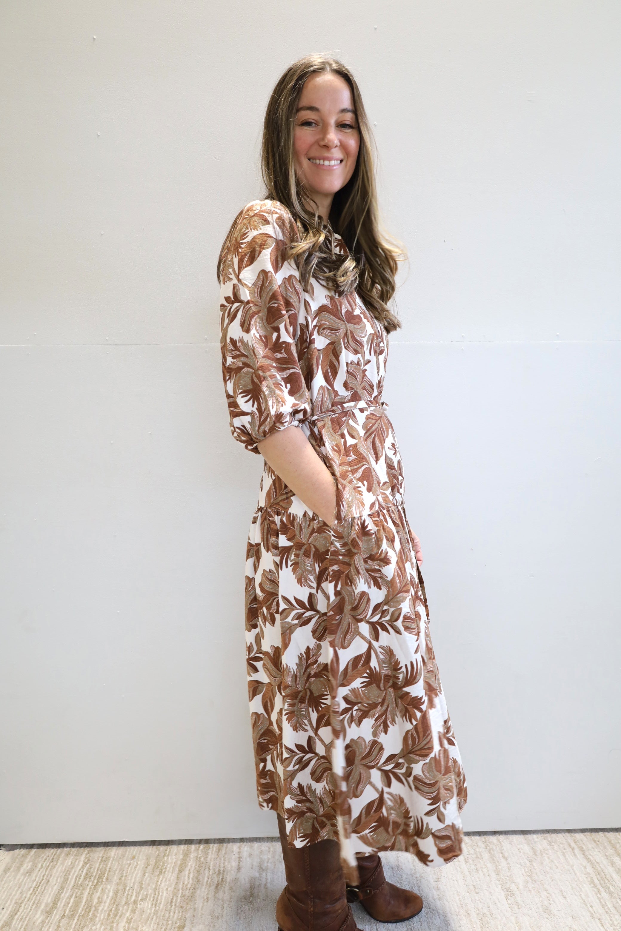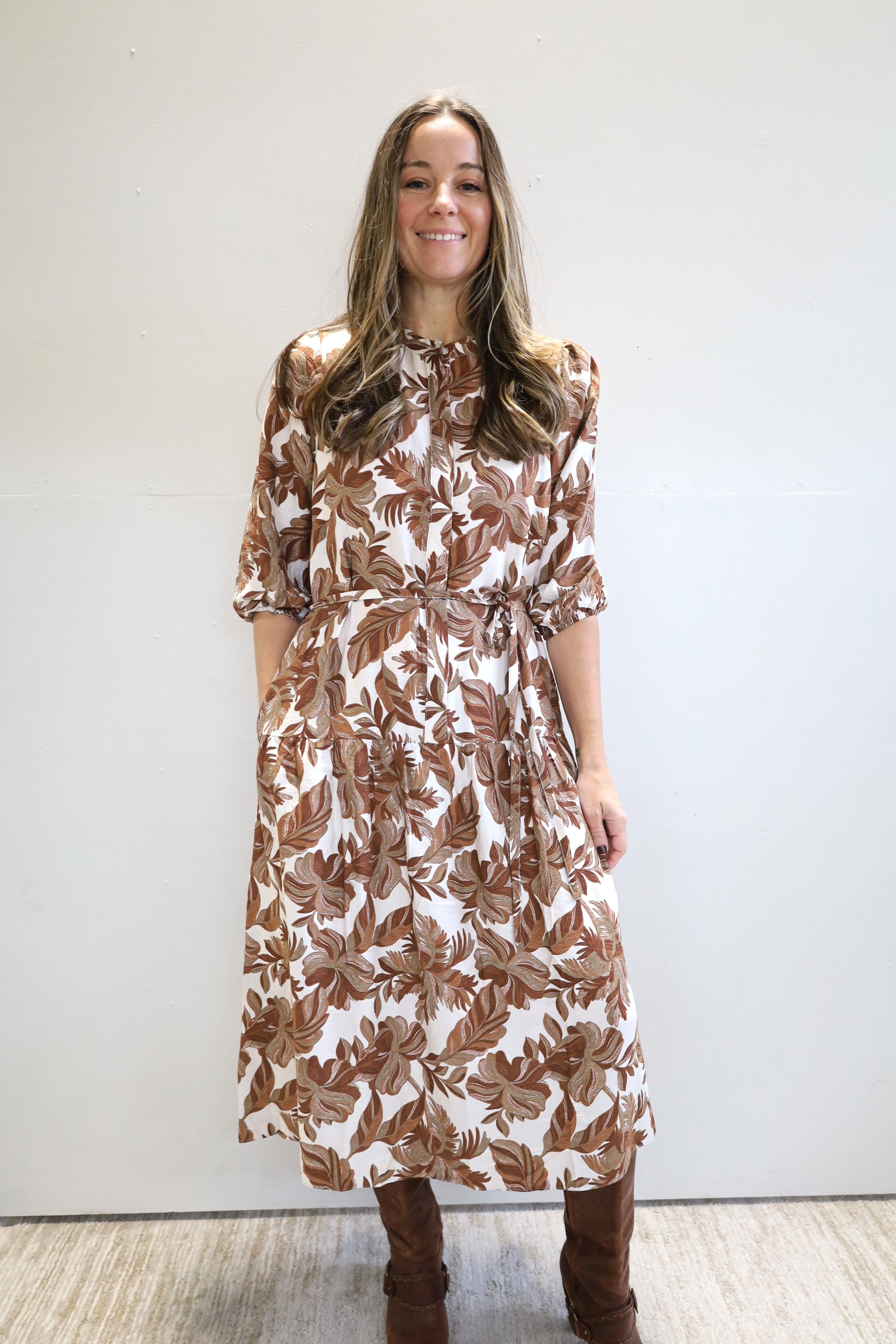 Your new favorite midi dress -- featuring a cinched waist and comfortable and versatile fit, which pairs easily with boots for a polished seasonal look.