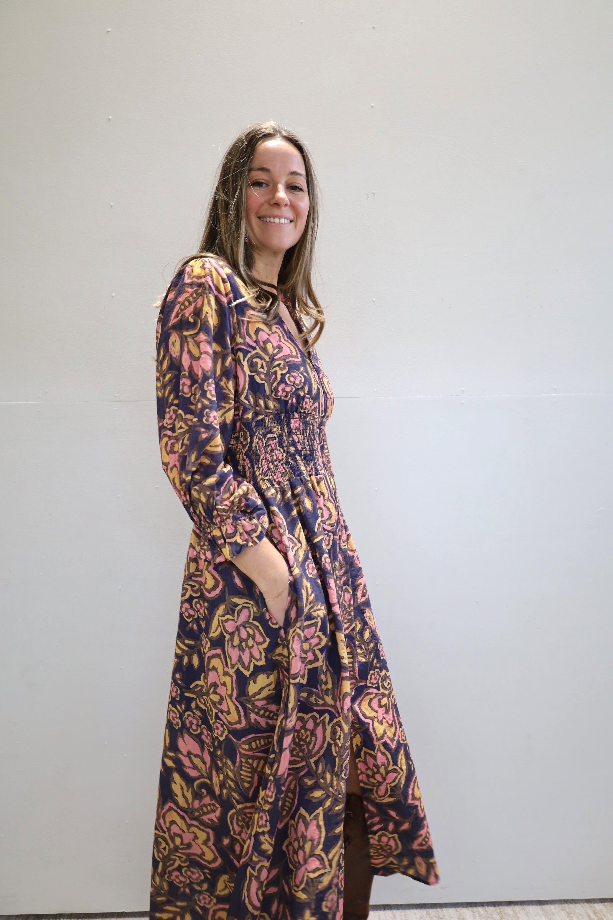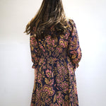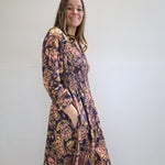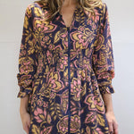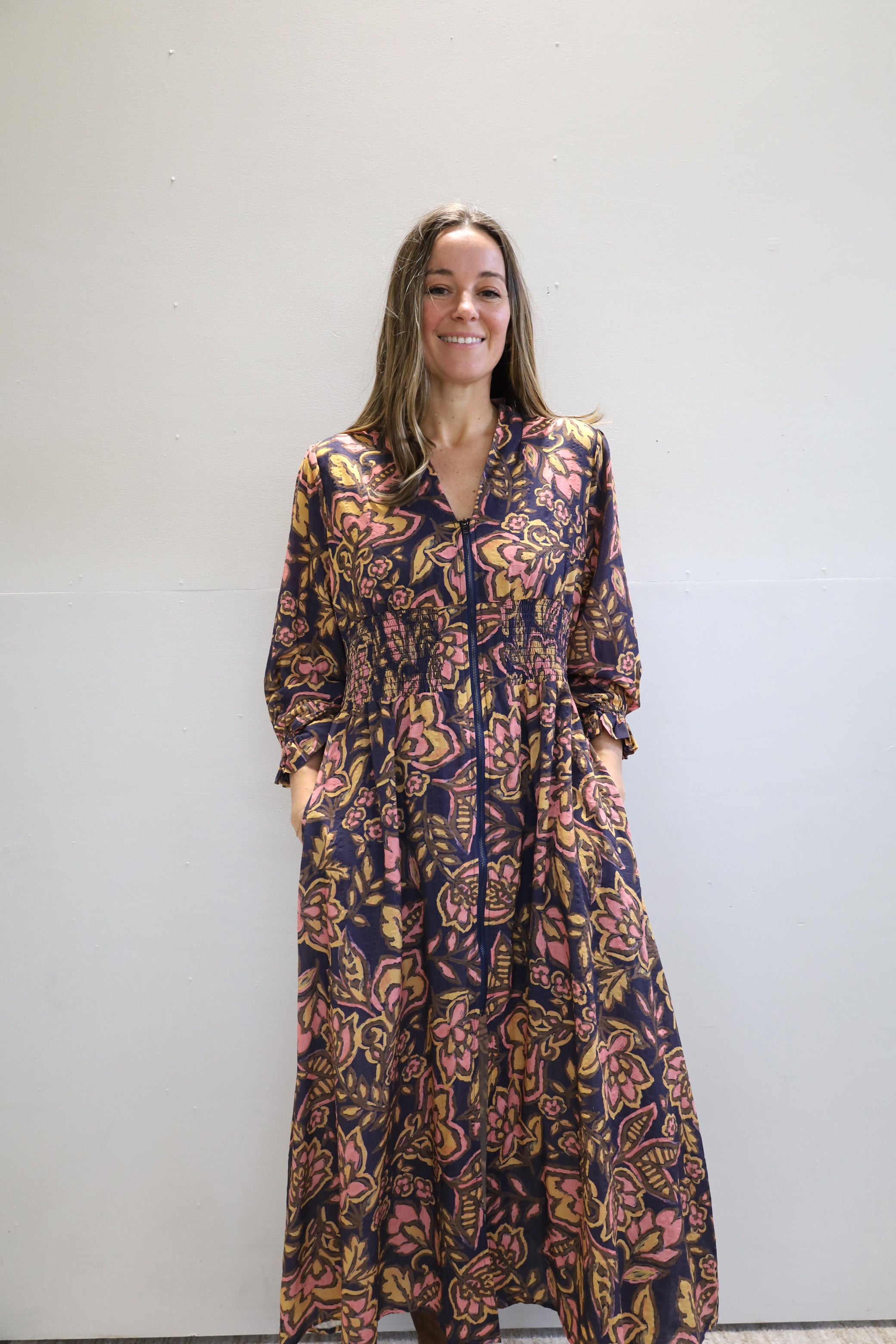 This midi-length dress features floral print with rich tones of navy, rose, and gold. Designed with a flattering gathered waist and a relaxed A-line silhouette, it offers effortless movement and all-day comfort. This dress also features a front zipper and practical side pockets which makes it perfect for everyday wear or special occasions.