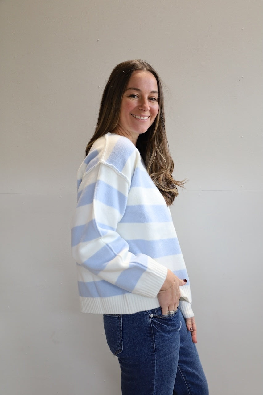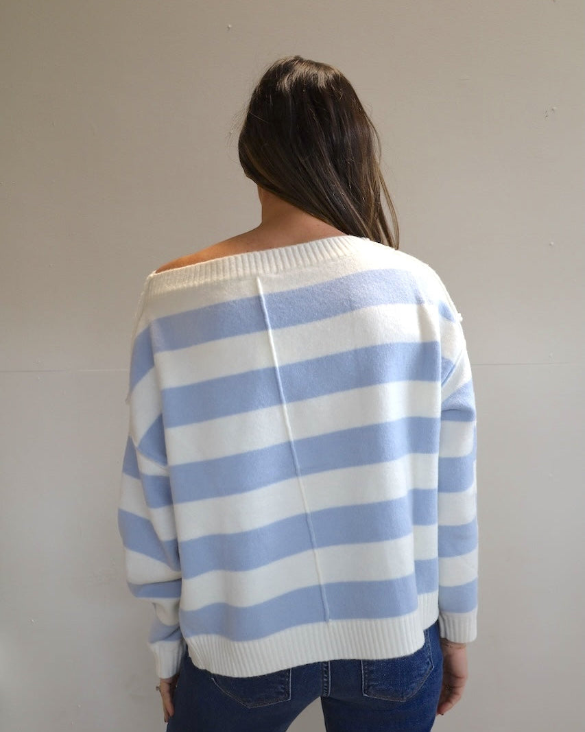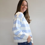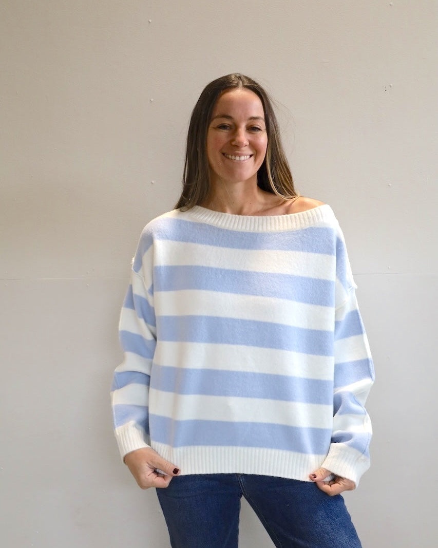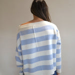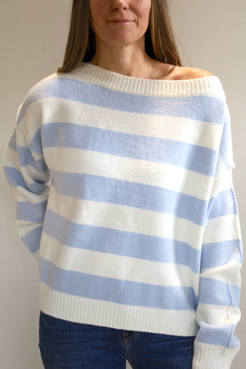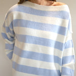 Soft, stylish, and effortlessly cool, this light blue and white striped sweater features a cozy and extra soft texture and a flattering off the shoulder neckline.