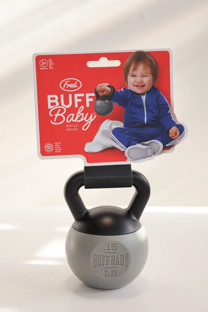 Shake things up with Fred’s Buff Baby kettlebell rattle. Lightweight and easy to grip, this adorable gym-inspired rattle is packed with clattering beads to keep babies focused on their "reps" for endless giggles and gains. Crafted from BPA- and phthalate-free, non-toxic virgin materials, it’s safe and fun for your little lifter.