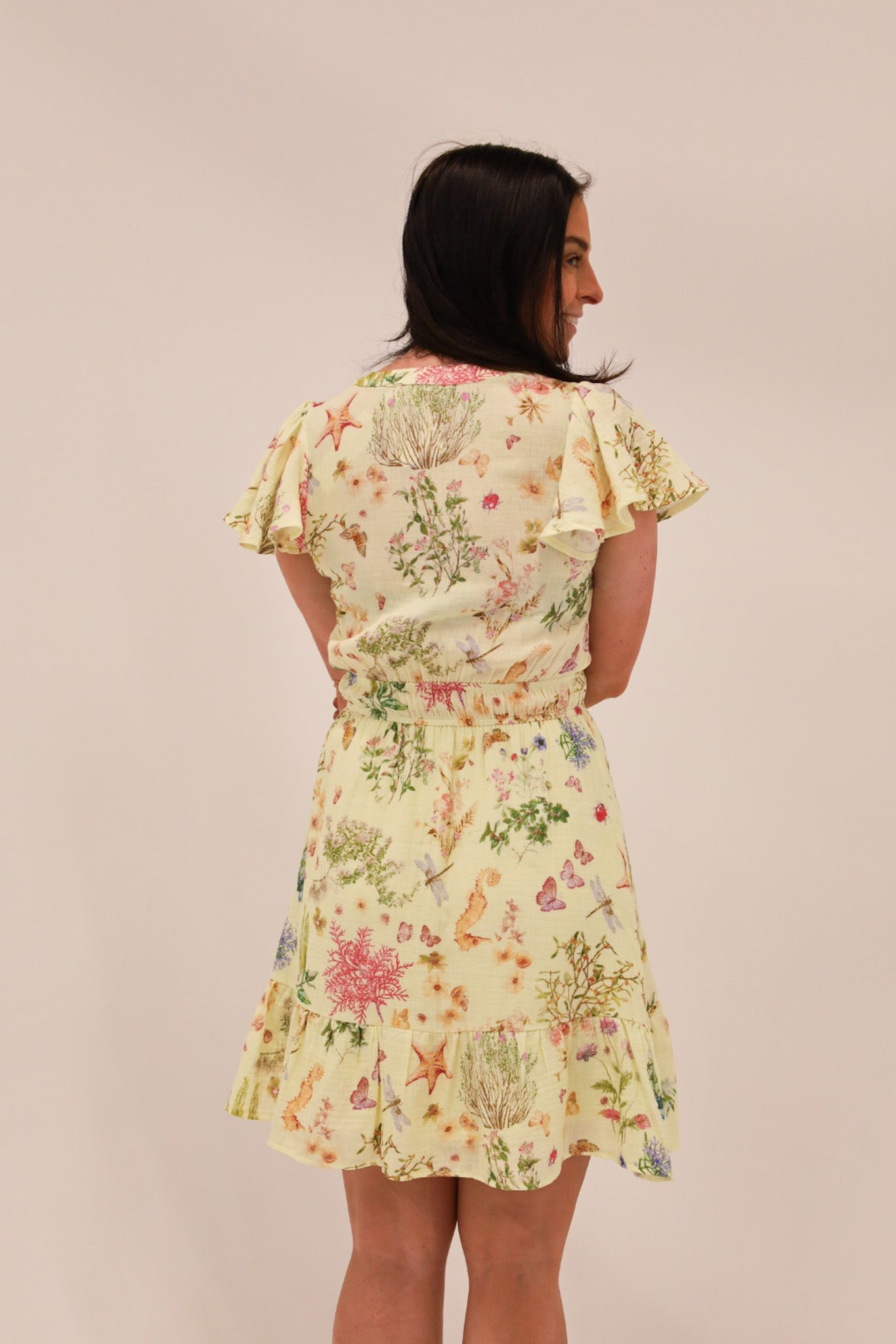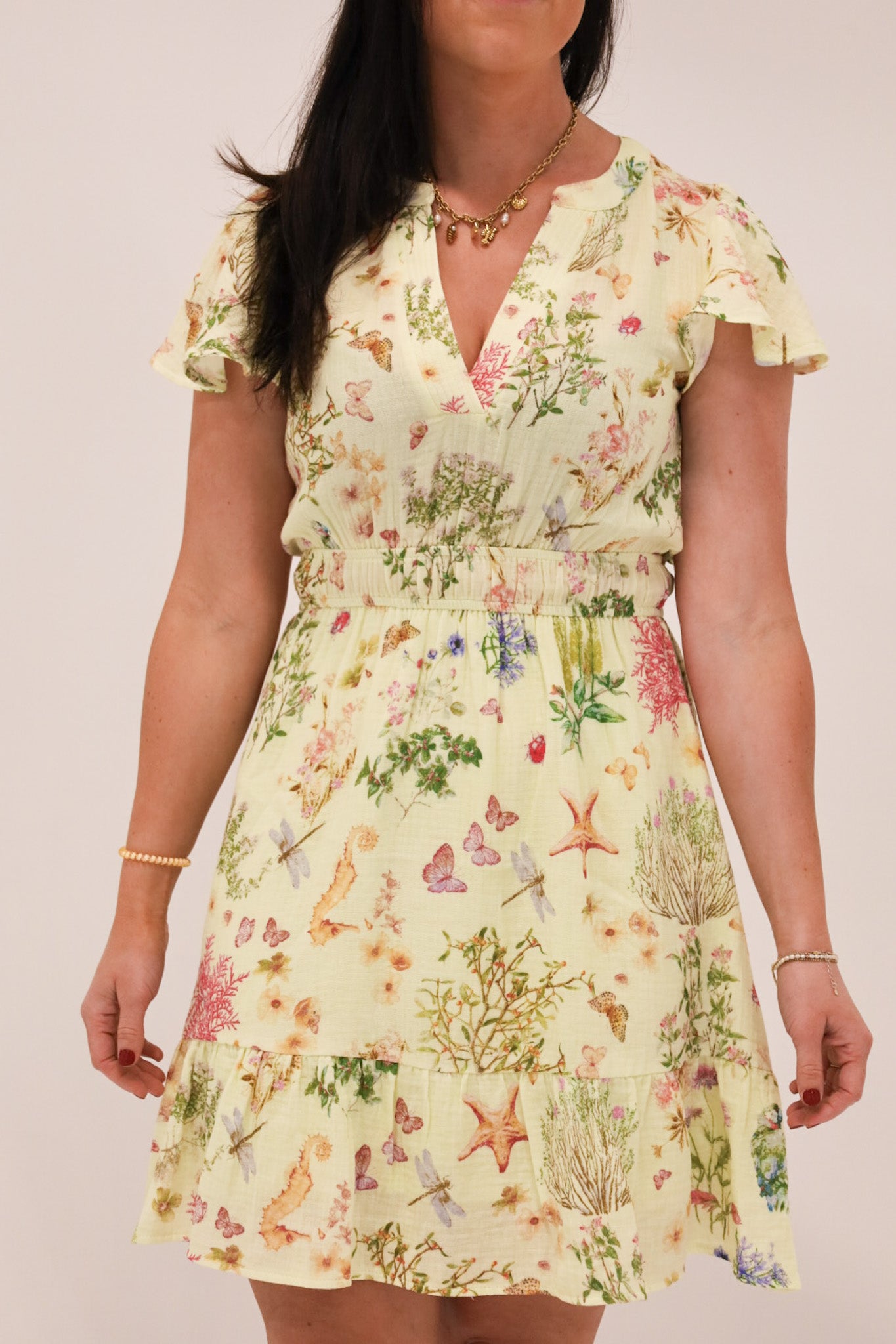 Floral meets sea - the perfect summer combo! This flutter sleeve dress is dainty and comfortable all summer long.