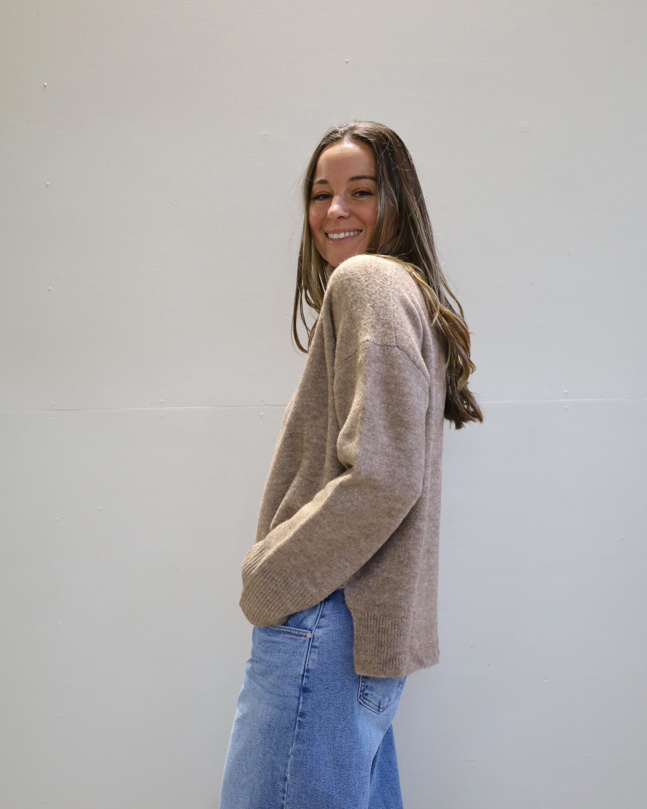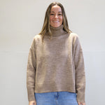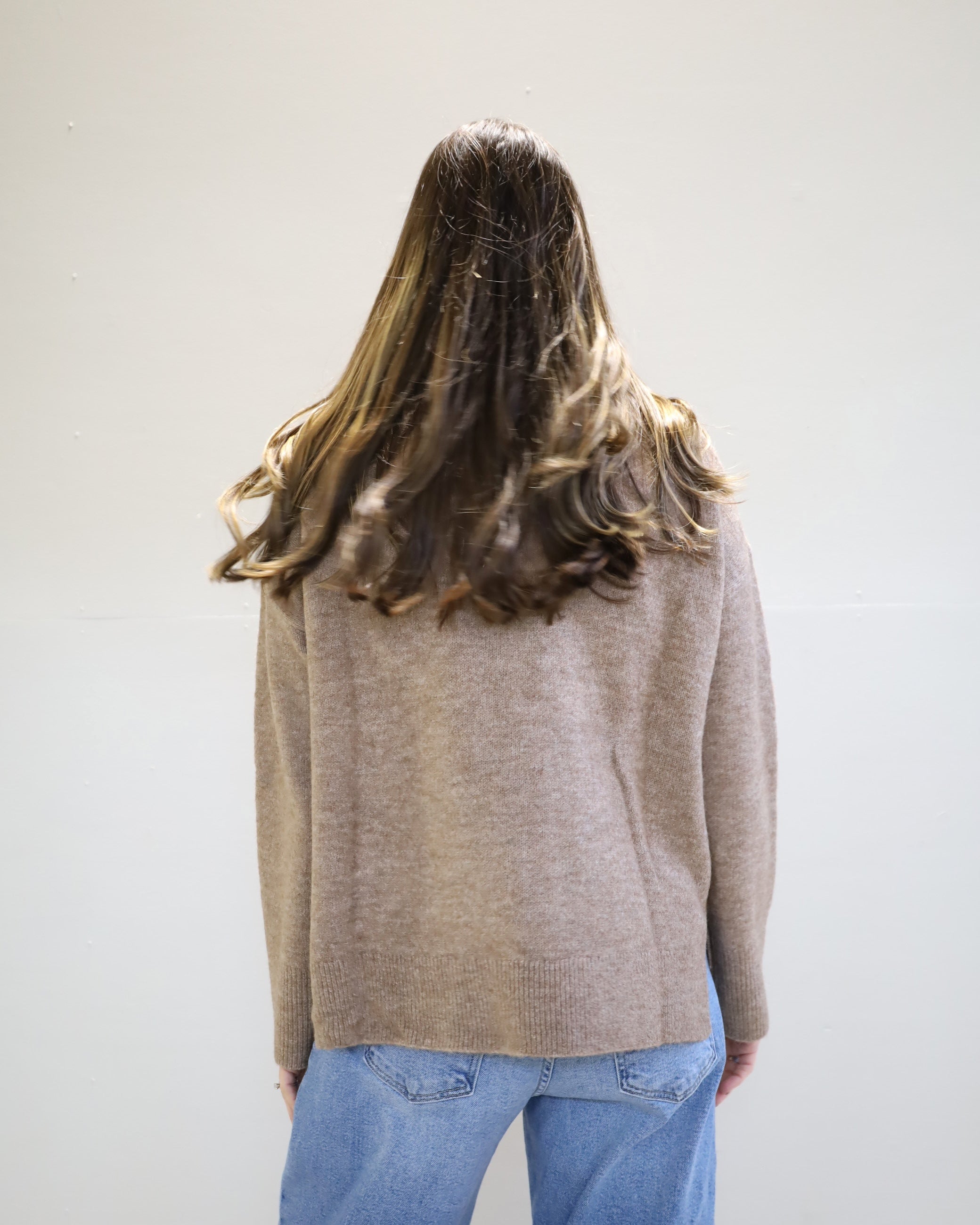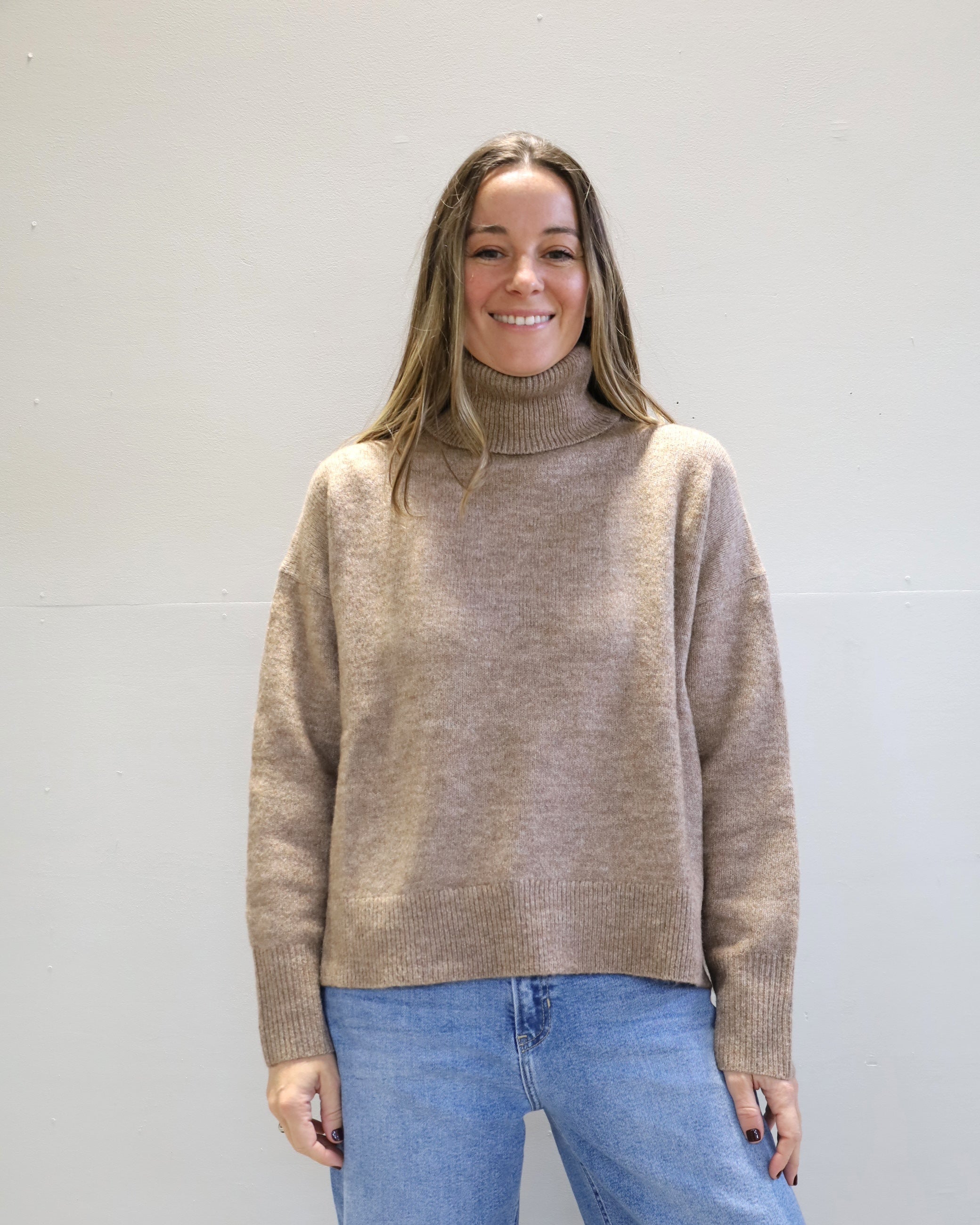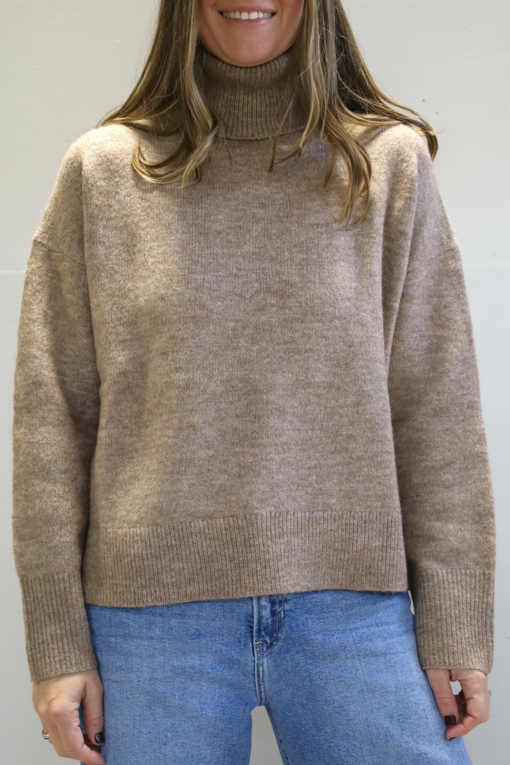 Your next closet staple! This muted shade of brown is perfect for everyone. The ribbed detailing on the turtleneck and sleeves are a classic look that can be worn for years to come.