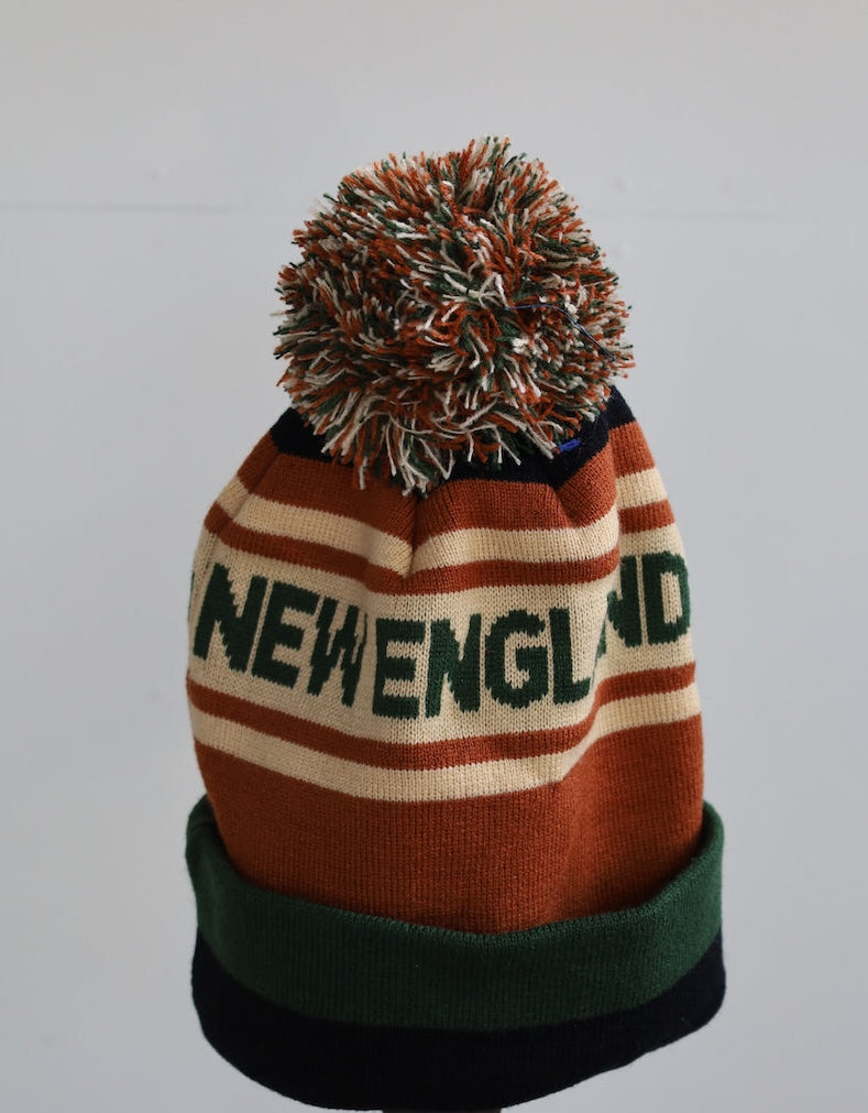 Cozy and classic, this “New England” pom beanie brings warm winter vibes in earthy greens and rust tones. Finished with a chunky multicolor pom and a fold-over cuff, it’s the perfect cold-weather accessory.