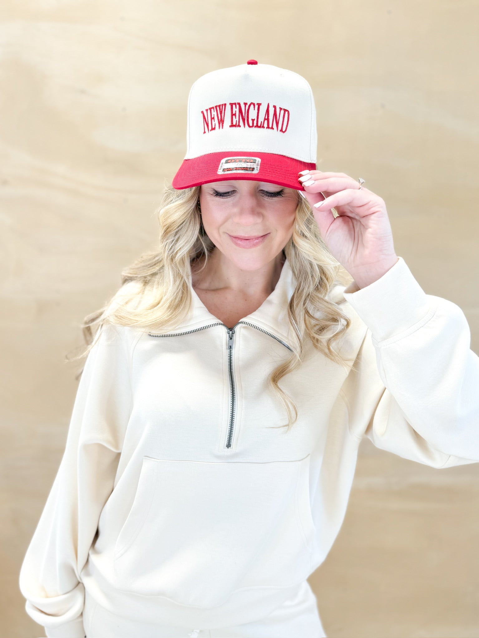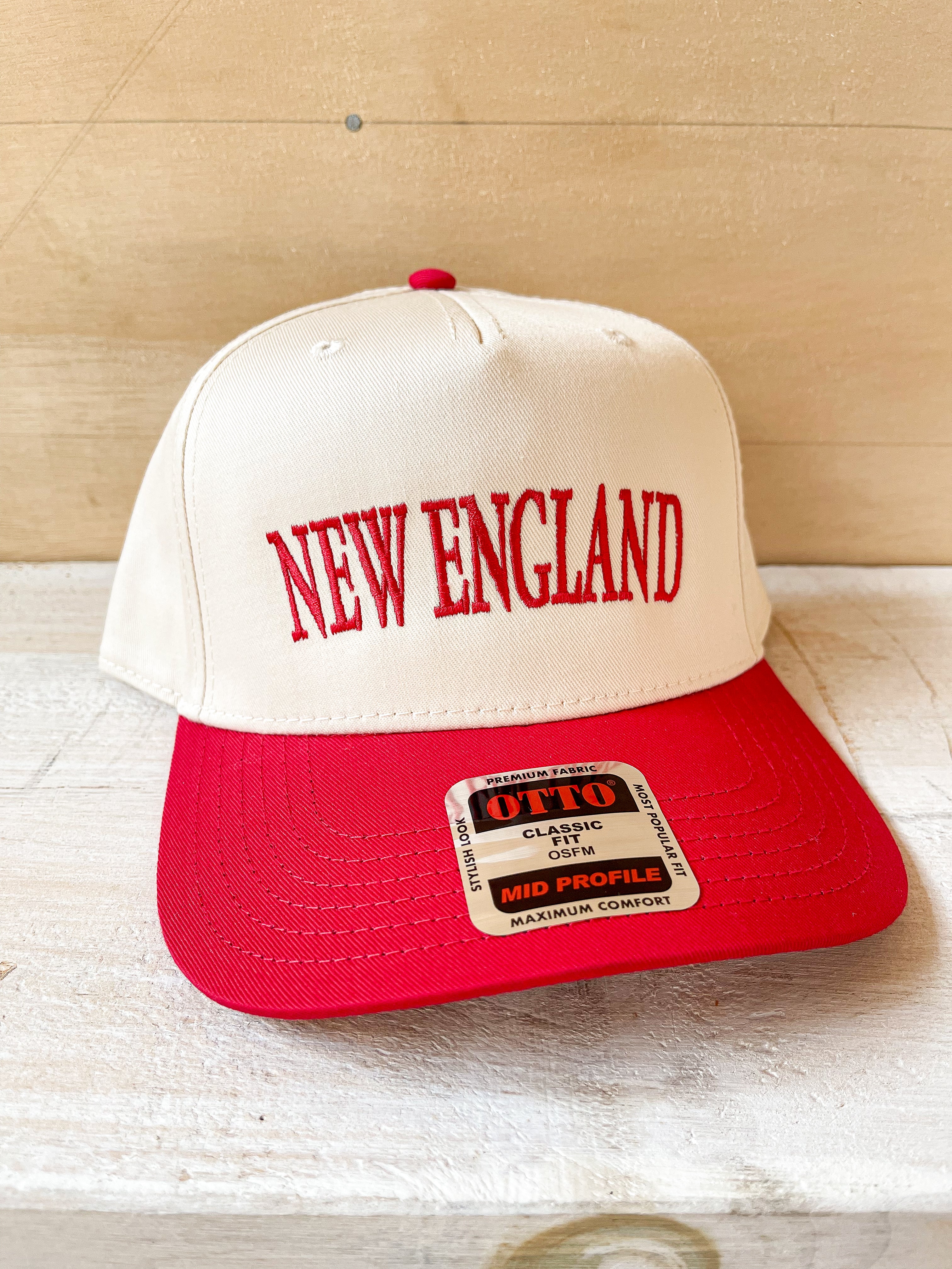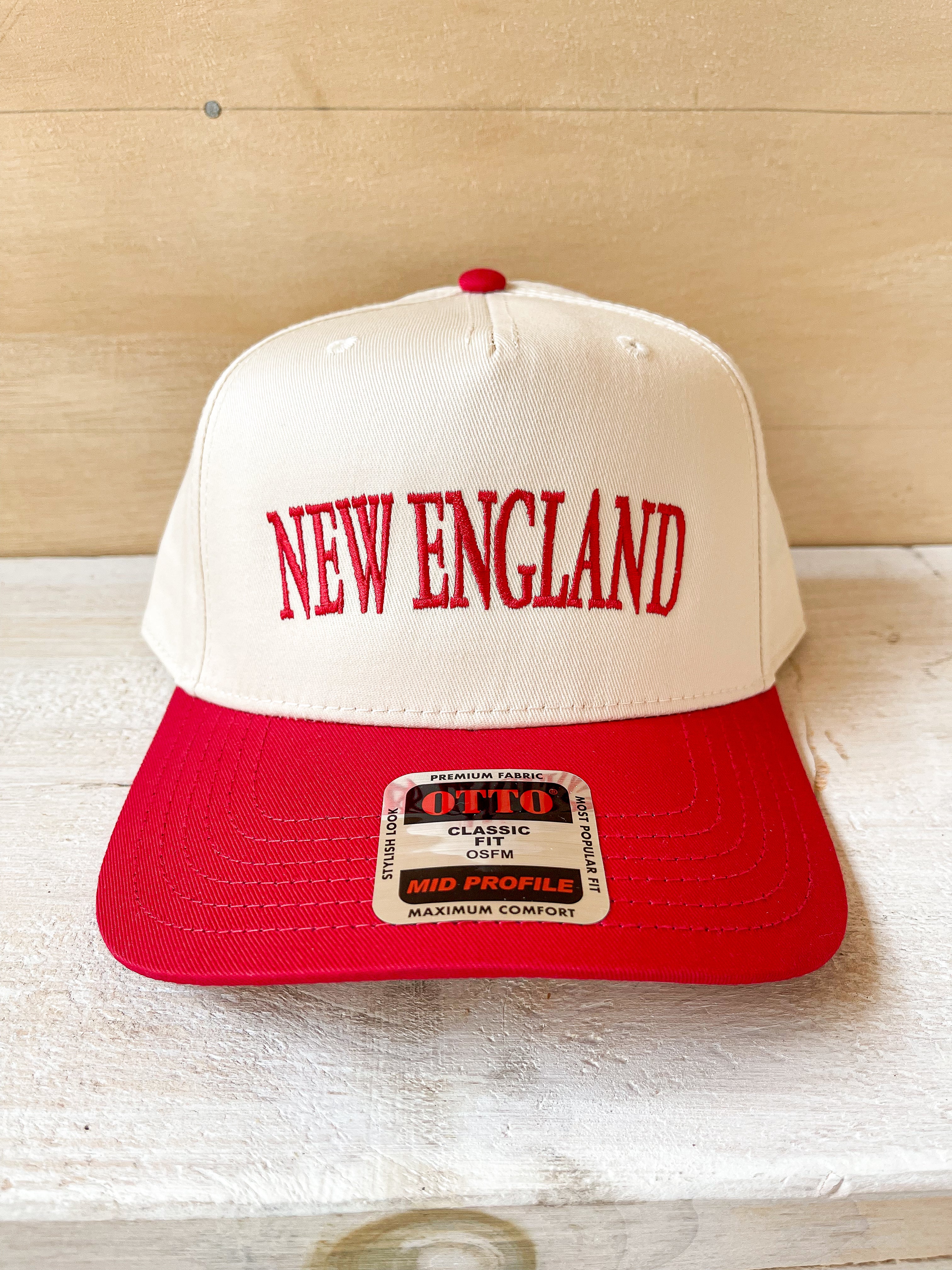 "The New England Hat in red is a timeless classic. Its embroidered design adds a fun touch, while the trucker style provides a comfortable fit. Show your love for New England with this stylish and versatile hat."
