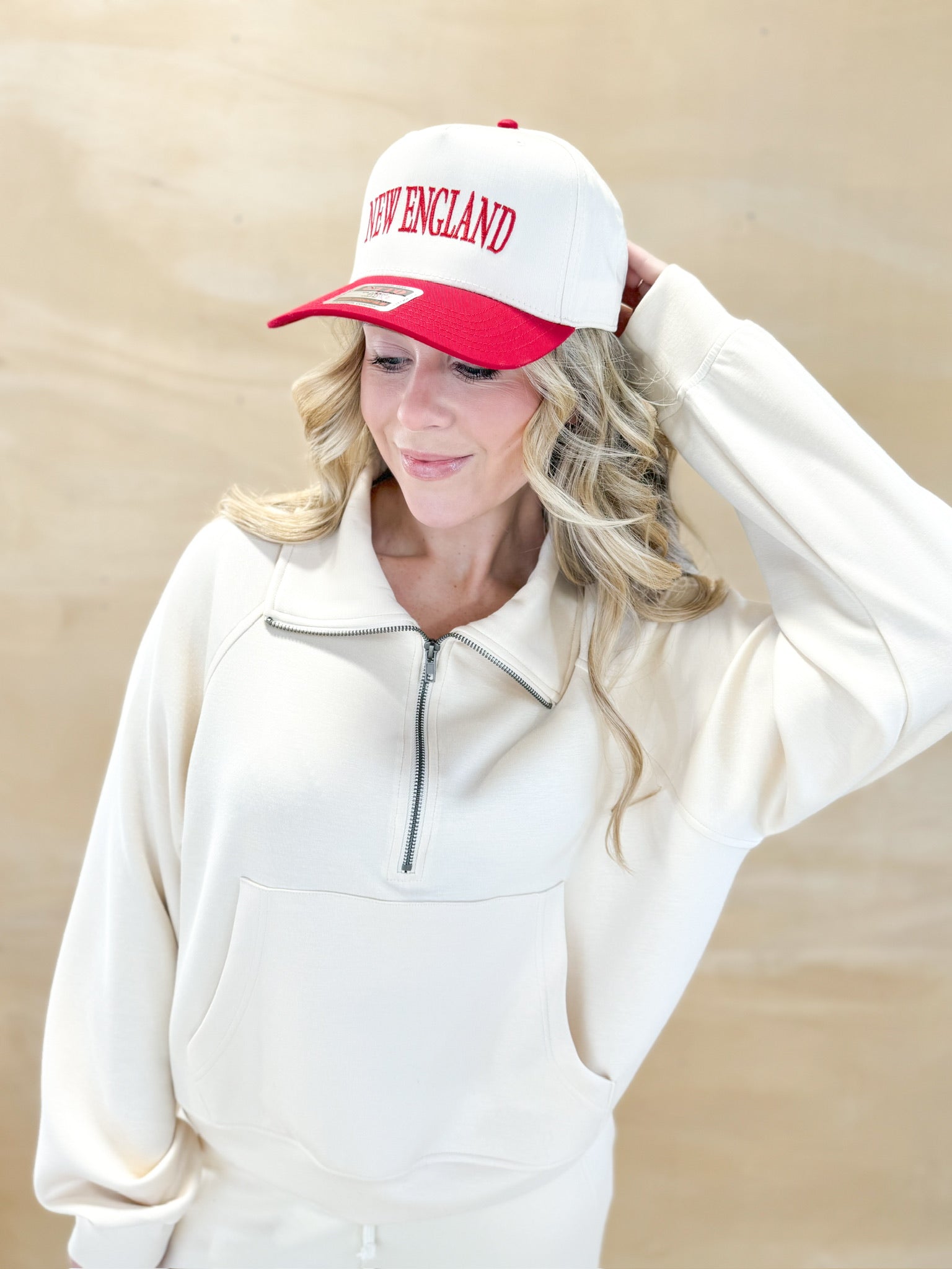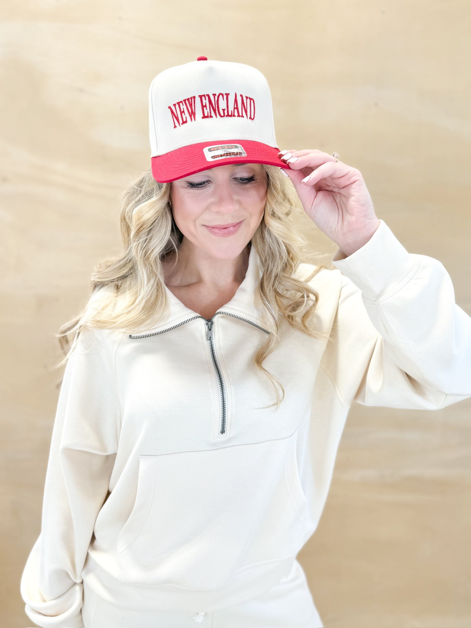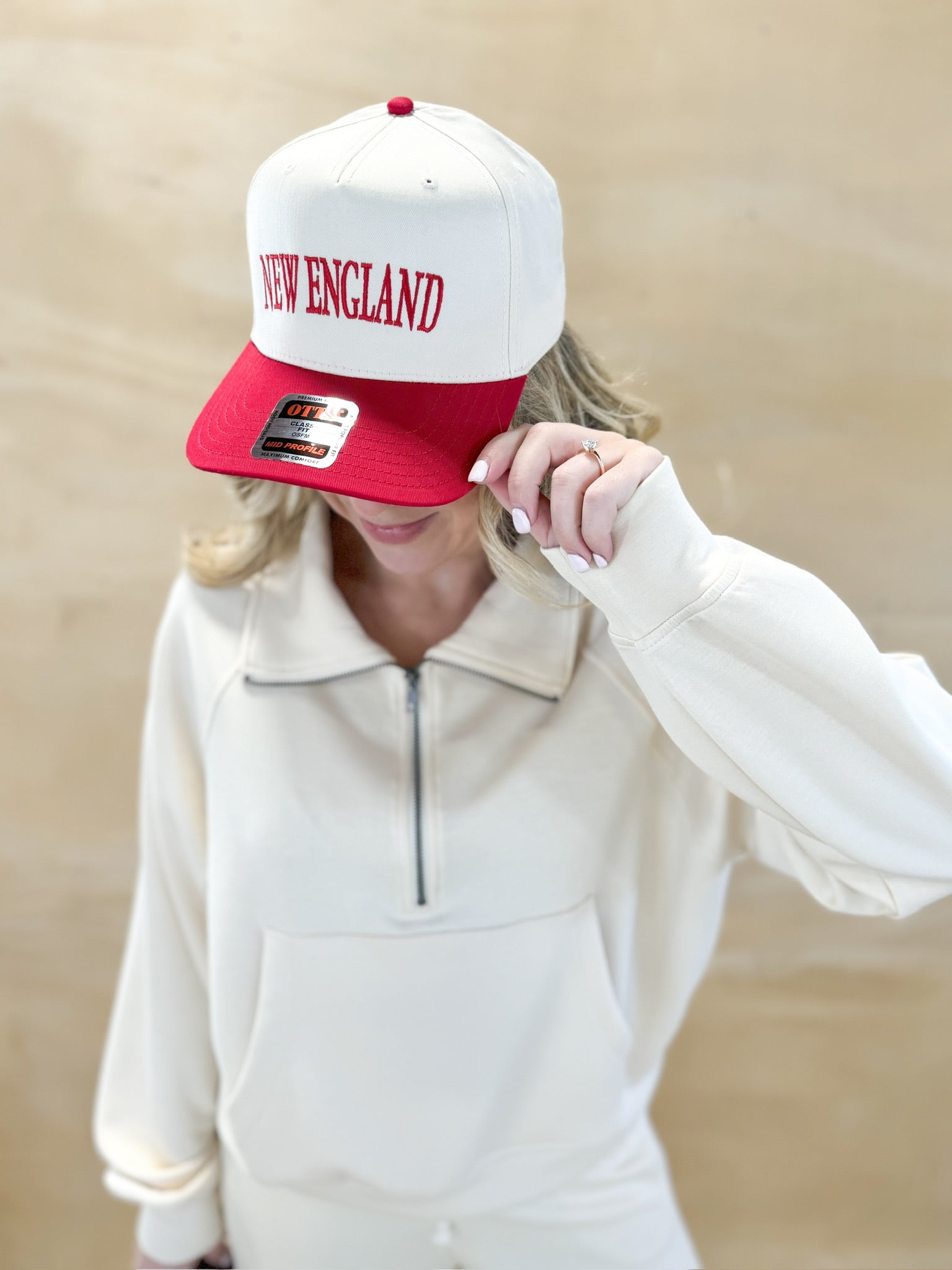 "The New England Hat in red is a timeless classic. Its embroidered design adds a fun touch, while the trucker style provides a comfortable fit. Show your love for New England with this stylish and versatile hat."