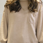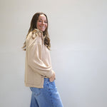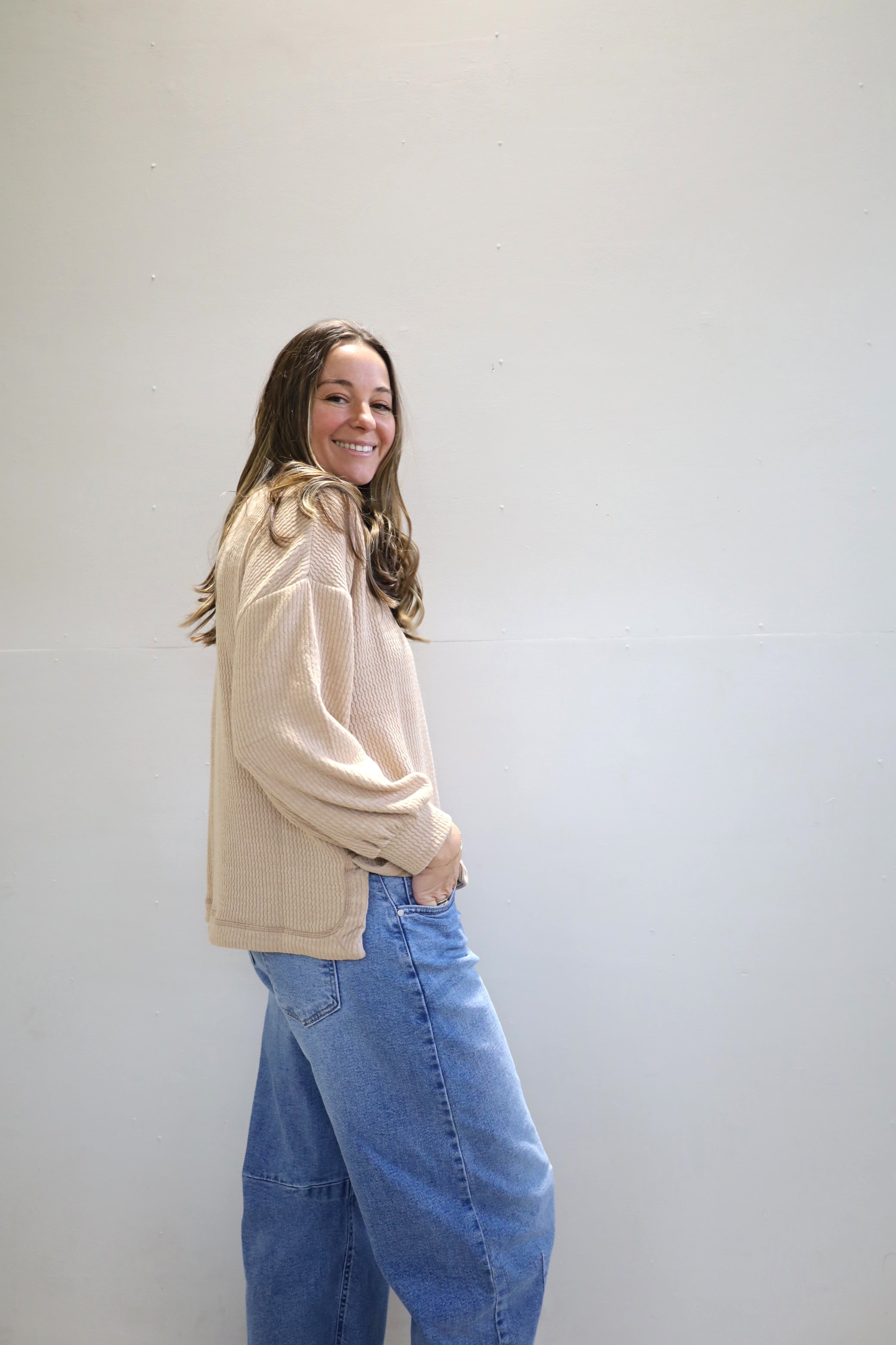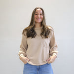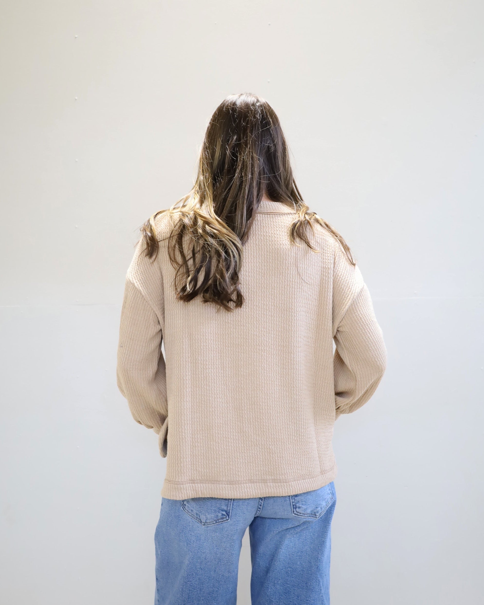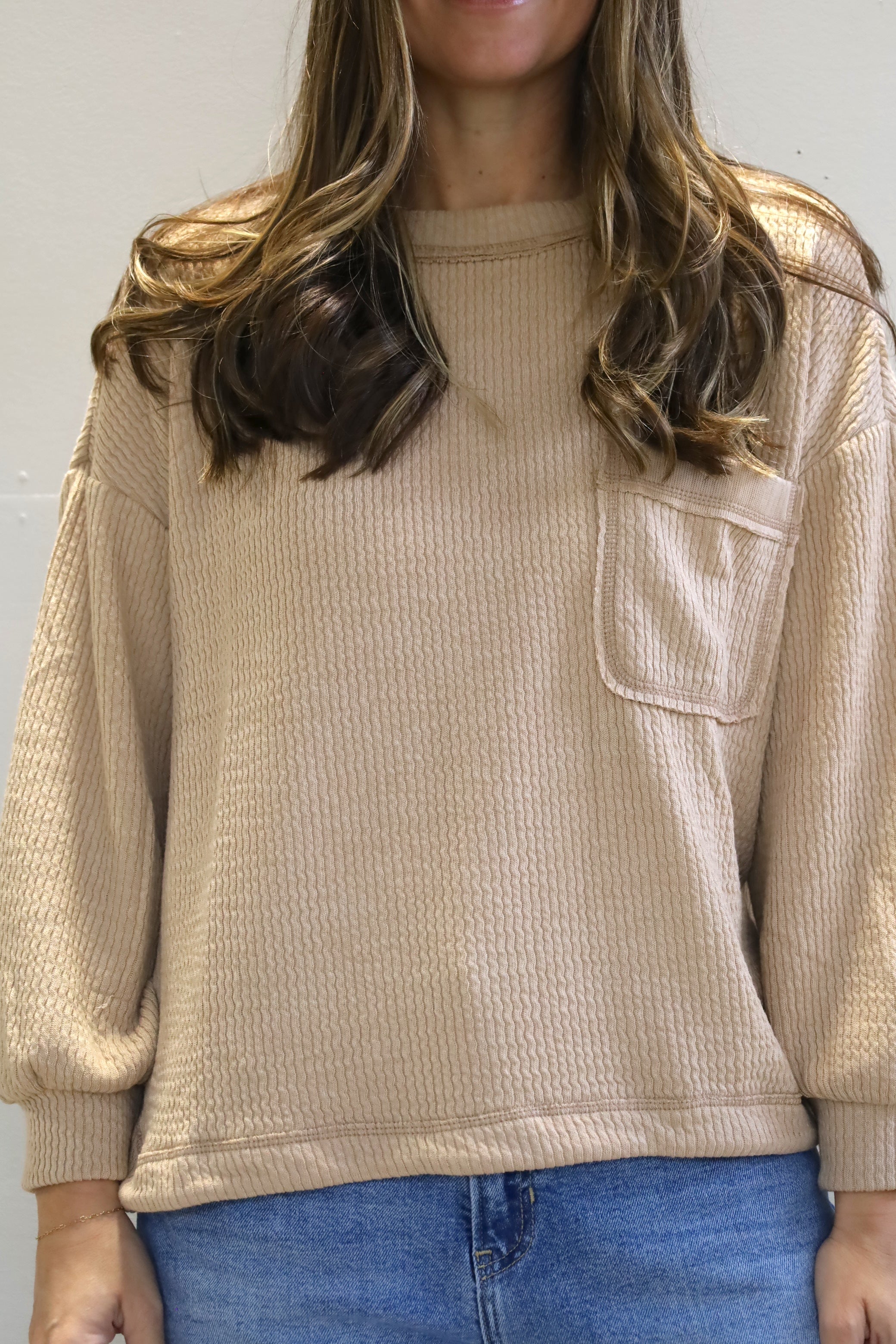 This textured long-sleeve features a front pocket and gently puffed cuffs for a laid-back yet polished feel. Its neutral and relaxed fit make it a go-to for effortless styling and layering.