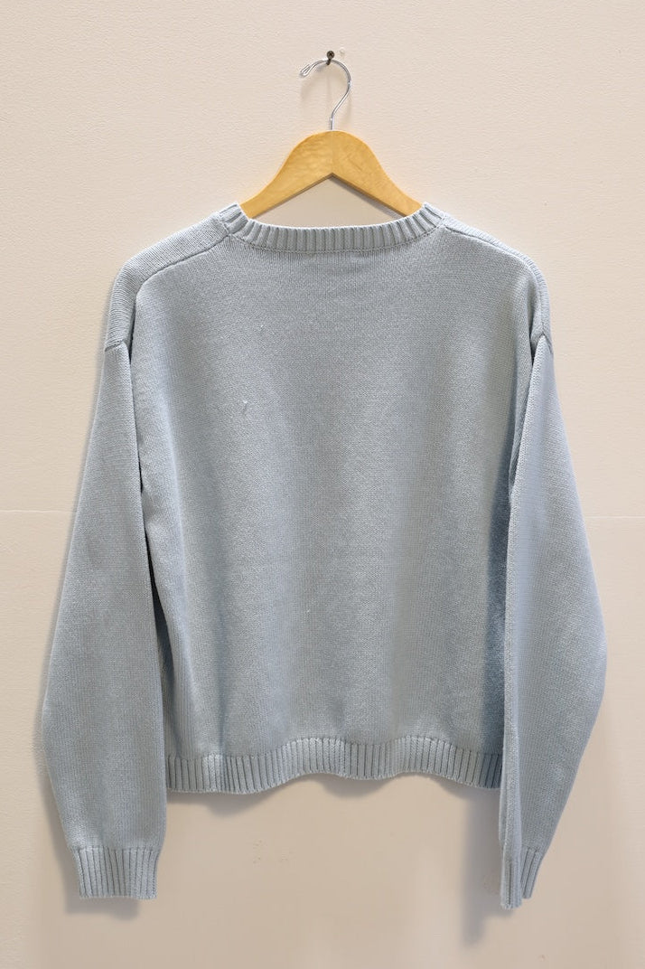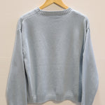 This soft blue knit sweater features a bold green fish motif that brings quirky charm to a classic, cozy silhouette.